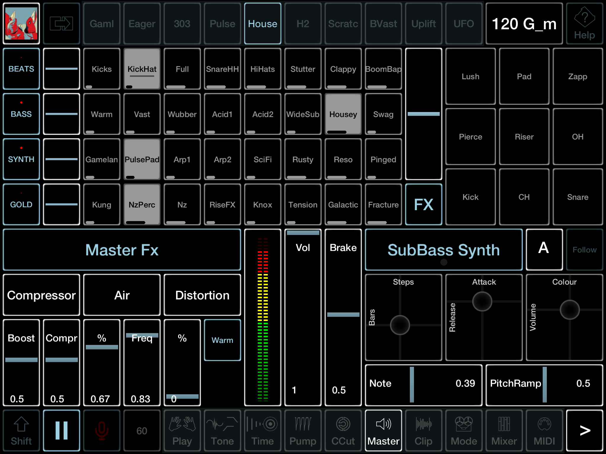 Die Patches starten durch das Drücken der Play-Taste und können manuell oder automatisch nacheinander wiedergegeben werden. Bei laufender Wiedergabe lassen sich die Clips aber auch beliebig miteinander kombinieren und durch Fingerfahrten bearbeiten, sodass man hier auch spontane Ideen umsetzen kann. Zur Unterstützung des Bassfundaments ist ein gut klingender Subbass-Synthesizer aktivierbar, der etwas versteckt im Masterbereich platziert ist und von den Bassdrum-Sounds in der ersten Spur getriggert wird. Die generierten Subbass-Sequenzen lassen sich anpassen und die Tonart frei bestimmen oder mit der des Packs in Übereinstimmung bringen. Mit den Stab-Sounds können punktuelle Einwürfe erfolgen, interessante Klangverbiegungen sind mit einem Pitchfader möglich.