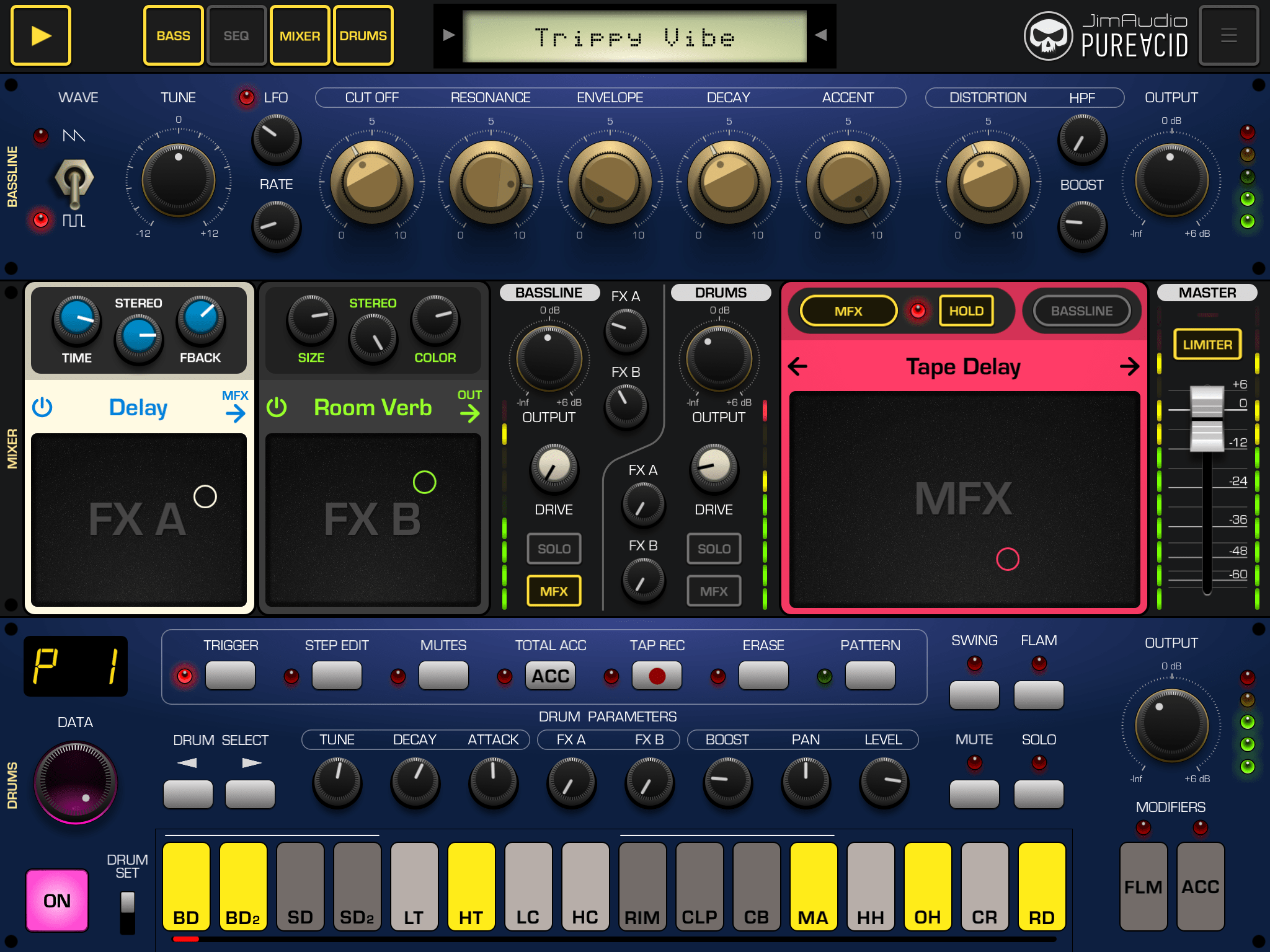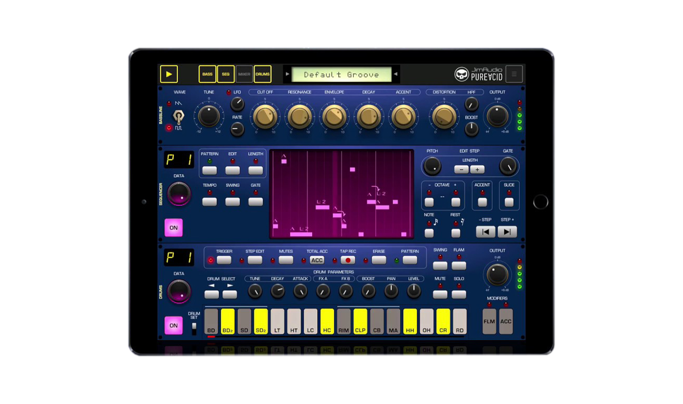 Pure Acid stammt aus der Feder von Dmitrij Pavlov, dessen Groovebox-App Groove Rider GR-16 schon für große Begeisterung unter den Usern gesorgt hat. Pure Acid kostet aktuell 17,99 Euro und bietet eine optisch ansprechend gestaltete Bedienoberfläche mit anpassbaren Farben. Zur Klangerzeugung gibt es einen TB-303-Bassline-Synth und eine Drum Machine, die jeweils per Sequenzer kontrolliert werden. Eine zweikanalige Mixersektion mit Effekten erlaubt das Abstimmen der Pegel. Die Bedienung erfolgt intuitiv mit virtuellen Bedienelementen auf dem Bildschirm oder extern per einfach zuweisbarem MIDI-Controller. Dank integrierter AUv3-, Audiobus- und Inter-App-Audio-Schnittstellen lässt sich Pure Acid zur Musikproduktion auf einem iOS-Gerät nutzen. Den Fokus meines Praxischecks habe ich aber auf den Standalone-Einsatz im Rahmen eines Live-Acts gelegt und mir zudem angeschaut, wie die Ergänzung eines DJ-Sets gelingt.