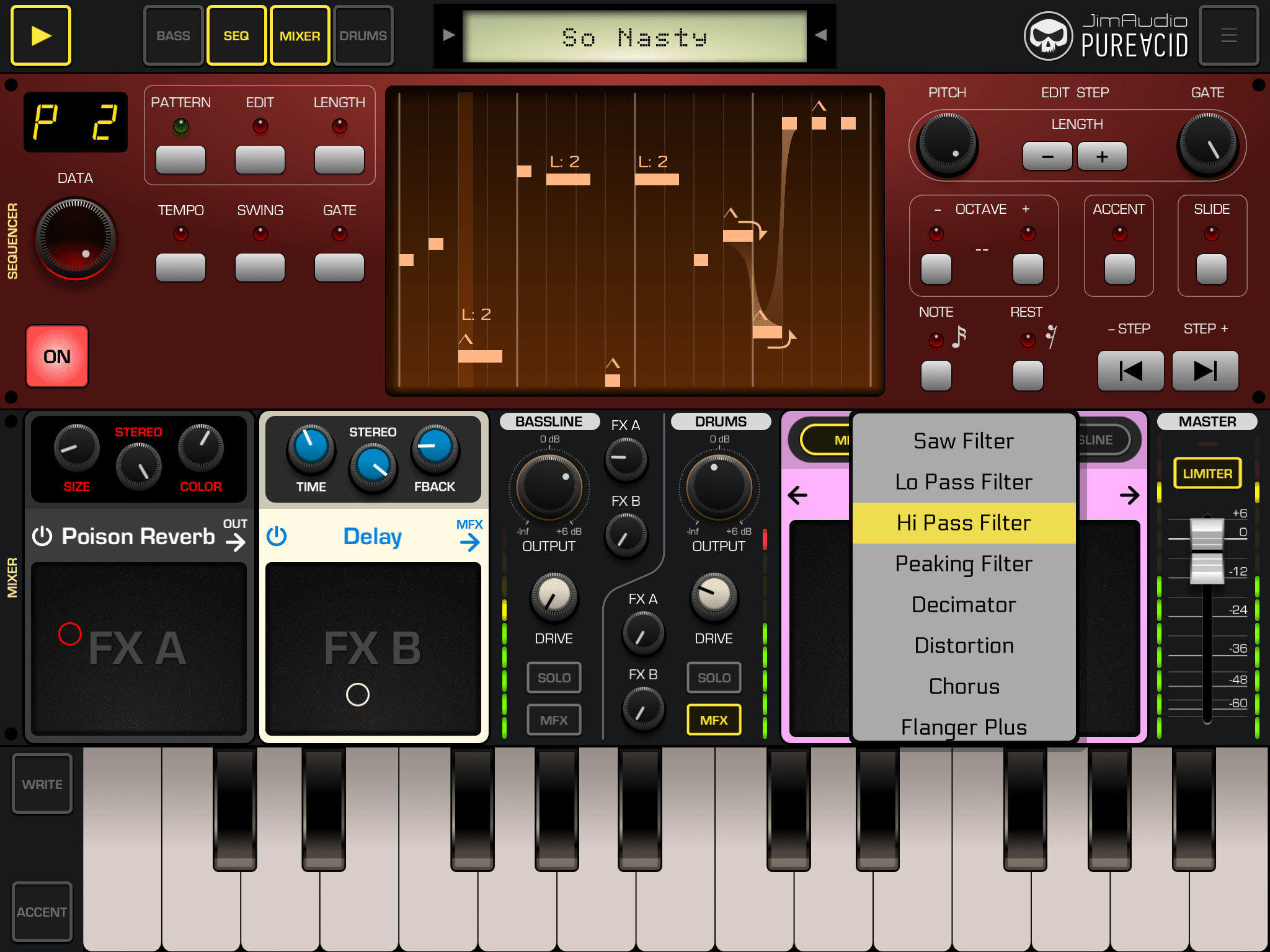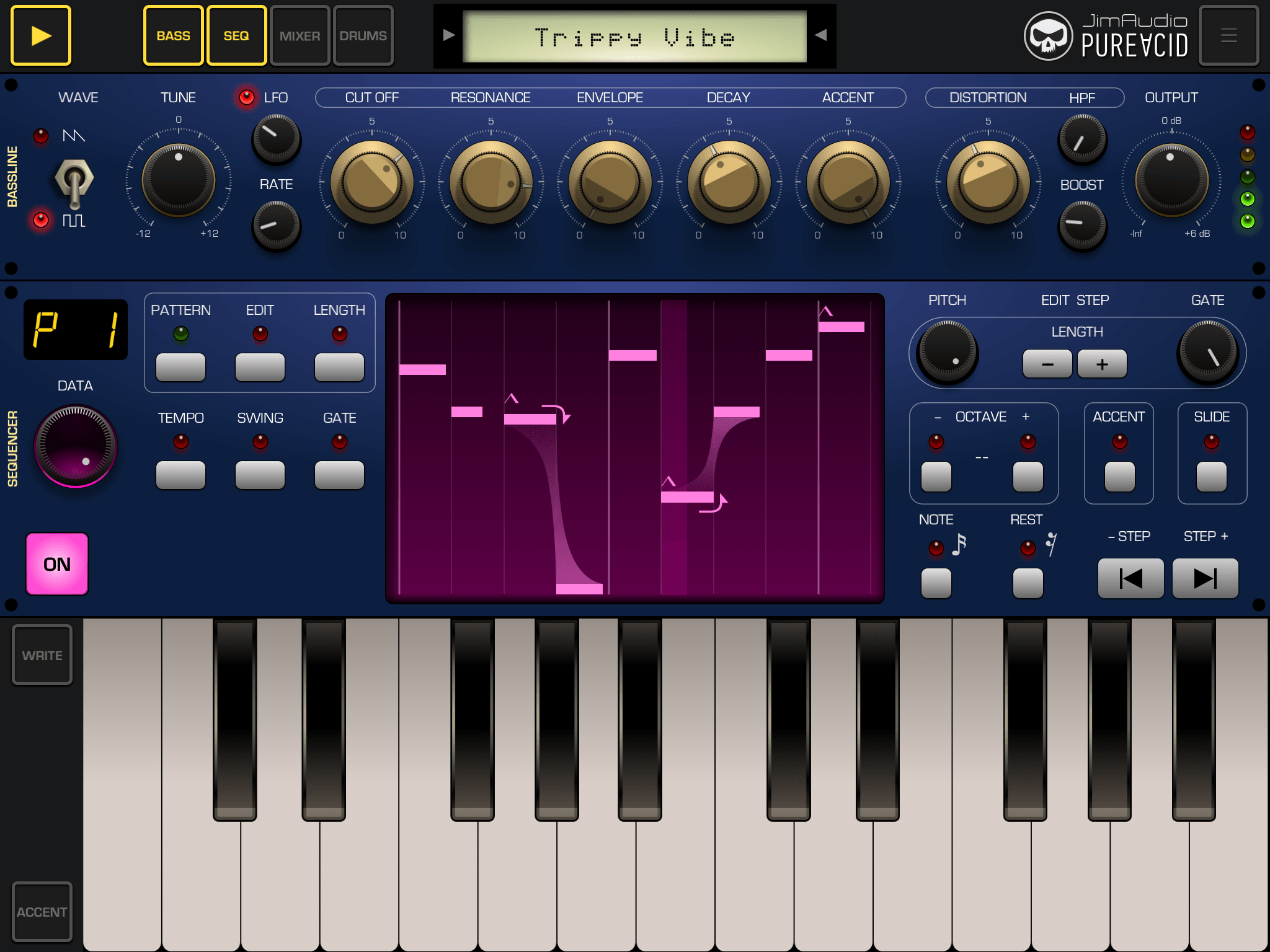 Die Bassline-Sektion der App ist wie das Roland-Original mit den Grundwellenformen Sägezahn und Rechteck ausgestattet. Zur Klangformung steht ein Tiefpassfilter mit Resonanz bereit, das für den charakteristischen Sound zum größten Teil verantwortlich ist und bei der Hardware aufgrund hoher Bauteiltoleranzen dazu führte, dass jede 303 etwas anders klang. Des Weiteren gibt es gut bedienbare Potis zur Steuerung der Parameter Envelope, Decay und Accent sowie Tune. Pure Acid bietet zudem sinnvolle Ergänzungen in Form eines LFOs, der das Tiefpassfilter steuert, sowie einen Verzerrer, Boost und ein Hochpassfilter.