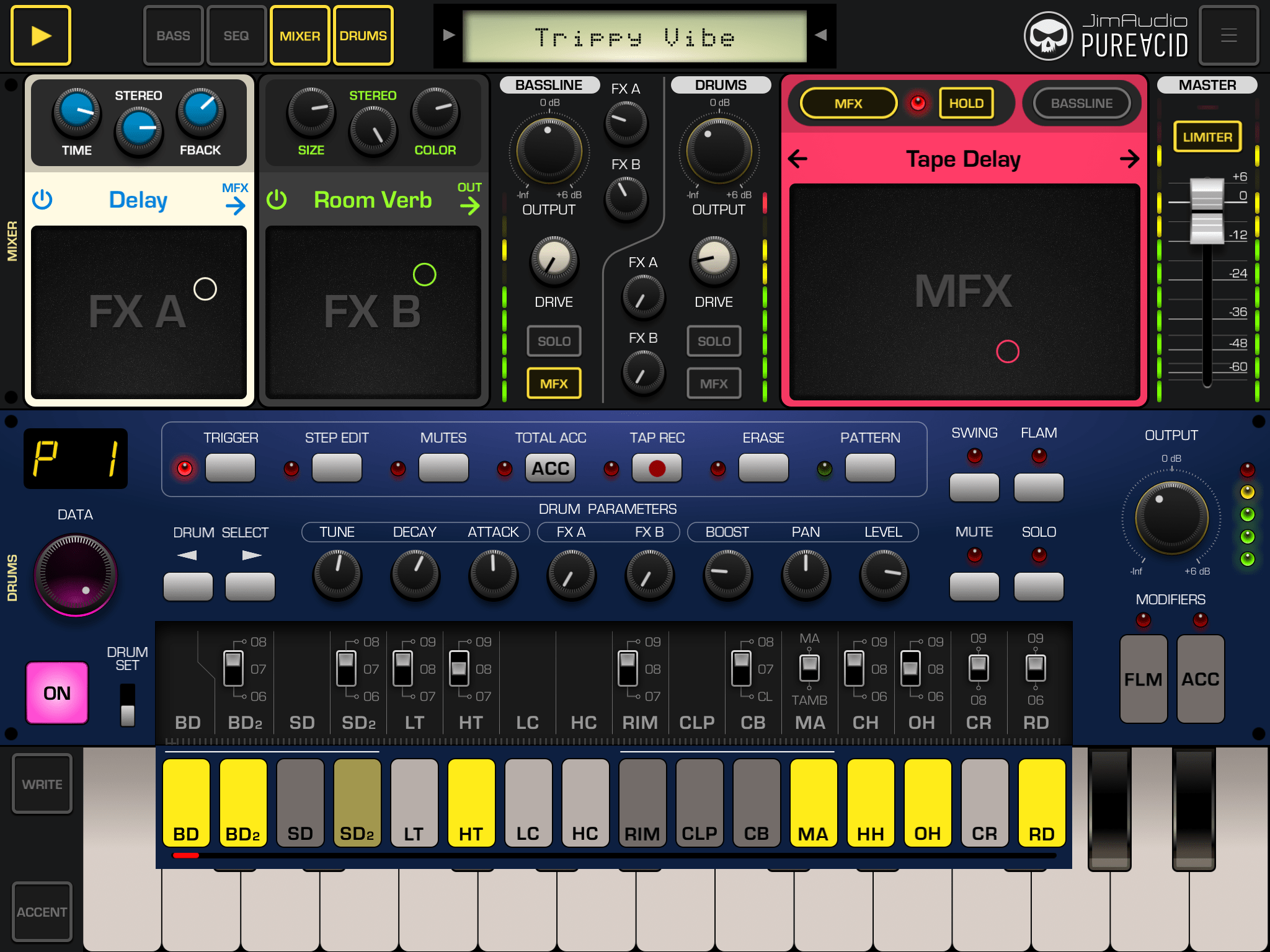 Das Einspielen oder Programmieren eigener Pattern gelingt am einfachsten, wenn man eine rhythmische Basis mit einem Drumbeat kreiert. Die gewünschten Drumsounds lassen sich bequem selektieren und mit den darüber platzierten Drehreglern anpassen. Die generierten Drumpattern sind per Swing- und Flam-Funktion (Mehrfachanschlag) lebendig modellierbar. Ein Pattern kann bis zu 16 Steps lang sein und in 12 Pattern- und vier Fill-Slots gespeichert werden. Pure Acid bietet 35 authentisch klingende Drumsounds zur Auswahl, die für ordentlich Druck sorgen.