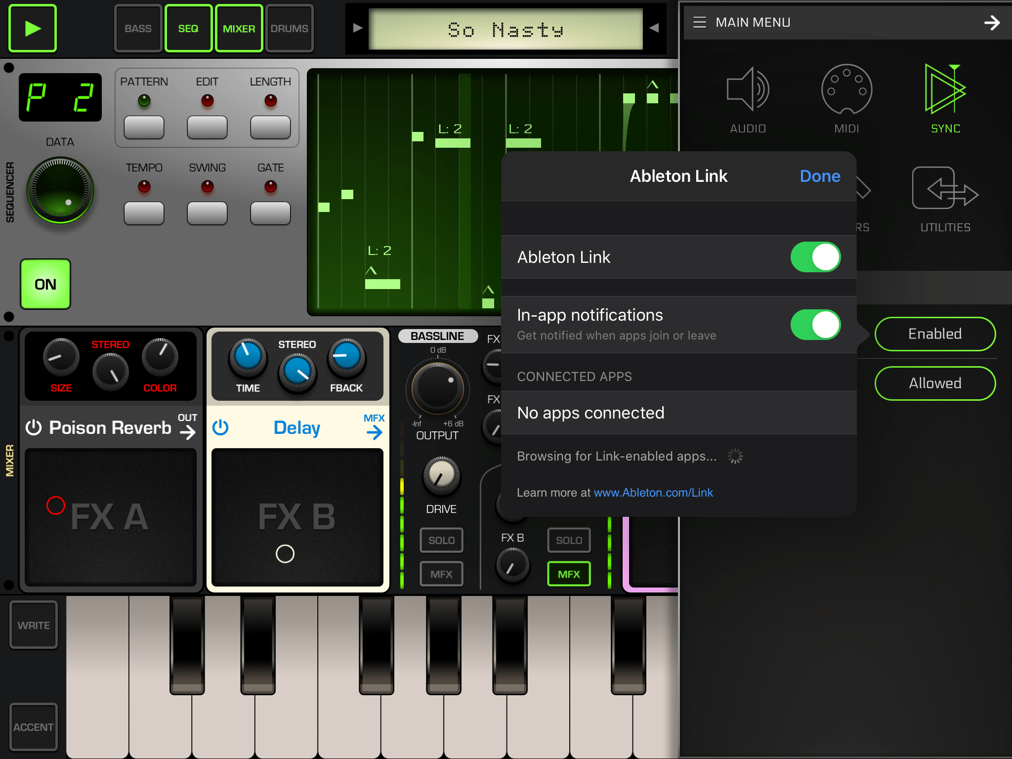 Möchte man die App Pure Acid live oder als Ergänzung zu einem DJ-Set nutzen, lassen sich die programmierten Pattern in Echtzeit manuell selektieren oder alternativ als Pattern-Chain mit wählbaren Wiederholungen nacheinander wiedergeben. Einen echten Songmode mit Parameterautomationen oder Einstreuungsmöglichkeiten für Fill-Pattern gibt es aktuell allerdings (noch) nicht. Im Live-Kontext ist das allerdings auch nicht sonderlich dramatisch, da hier in der Regel eine manuelle Steuerung bevorzugt wird. Ich empfehle zur Kontrolle der Synthie-Parameter einen Hardware-Controller, da man so etwas gezielter in den Klang eingreifen kann. Die Zuweisungen der Steuerungen zu den Bedienelementen ist per MIDI-Learn-Funktion sehr schnell erledigt. Für den zuverlässigen Gleichklang mit einer DJ-Software wie Traktor Pro, Serato DJ Pro oder Virtual DJ sorgt die integrierte Ableton Link Schnittstelle.