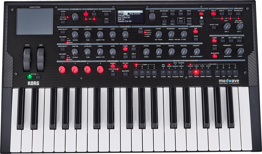 Auch die gummierten Mod Wheels wirken edel und überzeugen in Sachen Spielgefühl. Die beleuchteten Funktionstaster und das OLED-Display helfen bei der Menüführung und sorgen bei all den Features des Modwave für den notwendigen Überblick – zumindest nach etwas Einarbeitungszeit, denn der Wavetable Synth hat es in sich: 200 Wavetables, pro Programm zwei Oszillatoren, 13 Morphtypen, 12 Filter, fünf LFOs, vier steuerbare Hüllkurven, mehrspuriges Motion Sequencing, Effekte und noch vieles mehr.