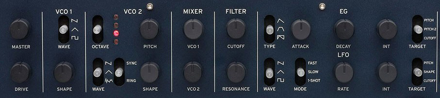Der LFO kann wahlweise entweder den globalen Pitch, Cutoff oder Shape der VCOs modulieren und bietet neben dem obligatorischen Wahlschalter für Saw-, Triangle- und Square-Wave auch die Möglichkeit zwischen drei verschiedenen Modi zu wechseln: One-Shot, Fast und Slow. Der One-Shot Modus kann äußerst kreativ eingesetzt werden, hier wird nur ein einziger Durchlauf des Steuersignals erzeugt, also keine periodische Schwingung. Der "Fast"-Mode ist ein besonderes Highlight: Hier werden Modulationsfrequenzen im Audiobereich ermöglicht. So lassen sich z.B. brachiale, teils Bitcrush-ähnliche Klänge erzeugen, wenn man die Wellenform (Shape) der beiden VCOs im Fast-Mode moduliert. Über das Program-Edit-Menü lässt sich der LFO auch zum globalen Tempo synchronisieren. Im MIDI-Slave-Modus auch zur DAW oder anderem Sequenzer.