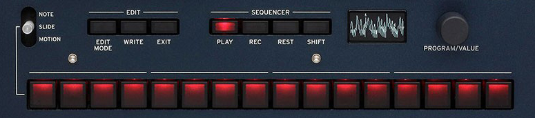 Mit Hilfe der 16 beleuchteten Buttons lässt sich jeder Step einzeln an- und ausschalten. Über einen Wahlschalter kann man von der Notenansicht in den Slide-Modus wechseln und pro Step einen TB303-ähnlichen Slide (Portamento) aktivieren. In der dritten Stellung befindet sich der Motion-Sequenzer-Modus. Hier können bis zu vier Regler des Synthesizers aufgezeichnet und automatisiert werden. Hierzu wird einfach im Record-Modus die Reglerbewegung live aufgezeichnet oder man kann bei gedrückter Step-Taste einen Wert pro Step feineinstellen. Dieses Feature ist wirklich mächtig! Es lassen sich nicht nur die Potentiometer für Filter oder Resonanz automatisieren, auch die Wahlschalter für die Wellenform oder das Modulationsziel können pro Step automatisiert werden. Boom!