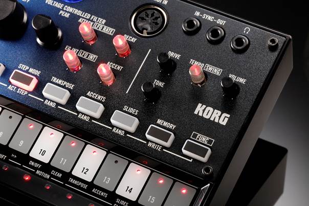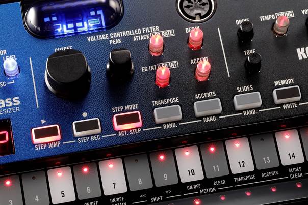 Bei aller Liebe für die 303 wird immer wieder ein Punkt genannt, der den Spielspaß am Gerät etwas schmälert: der umständlich zu bedienende Sequenzer. Zum Glück setzt man bei Korg auf Altbewährtes und verwendet beim Nubass das gleiche Design, das sich auch schon bei den vorangegangenen Volcas bewährt hat. Erweitert wird das Ganze durch ein paar sinnvolle Ergänzungen, um die Rolle des Gerätes als Basssynthesizer zu unterstreichen. Wie gewohnt besteht jedes Pattern aus maximal 16 Schritten, für längere Sequenzen können wiederum bis zu 16 Patterns beliebig verkettet werden.