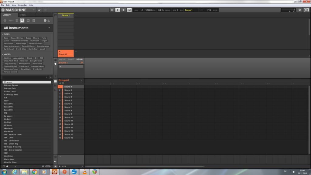 Von der sonstigen Aufmachung her wirkt Maschine 2 Essentials wie eine gewöhnliche DAW: In der Kopfzeile der Software befinden sich der Transportbereich und andere wichtige Elemente wie Optionen und Hilfemenüs. Ganz unten sieht man den Pattern-Editor mit togglebarer Piano Roll, der das Aufnehmen sowie Arrangieren von MIDI-Triggern und Audiosamples ermöglicht. Darüber liegt der Control-Bereich für die Verwaltung und Steuerung der Plugins. Von Kompressoren über Distortions, Delays, Reverbs bis zu Modulationseffekten ist in Maschine 2 Essentials Effektpalette bereits alles in mehrfacher Ausführung dabei. Bei Bedarf kann das Arsenal aber auch mit weiteren Plugins ergänzt werden. Die linke Bildschirmseite wird vom Browser eingenommen, über den der Zugriff auf Projekte, Sounds, Instrumente und Co. vorgenommen wird. Der Browser ist gut sortiert und die Maschine 2 Factory Selection bietet eine Menge brauchbarer Sounds für viele Genres.