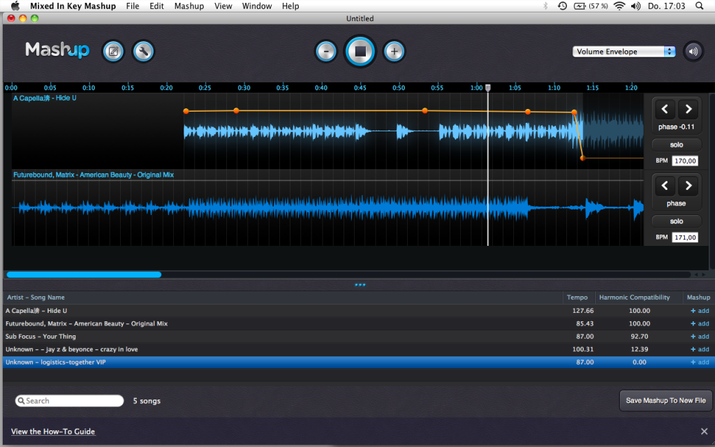 Jetzt muß man nur noch die Tracks an die richtige Stelle ziehen und gegebenfalls per Phasenknopf ein wenig nachrücken. Zum Abmischen steht einem noch eine Volume- und EQ-Hüllkurve zur Verfügung, die sich ganz simpel einzeichnen lässt.