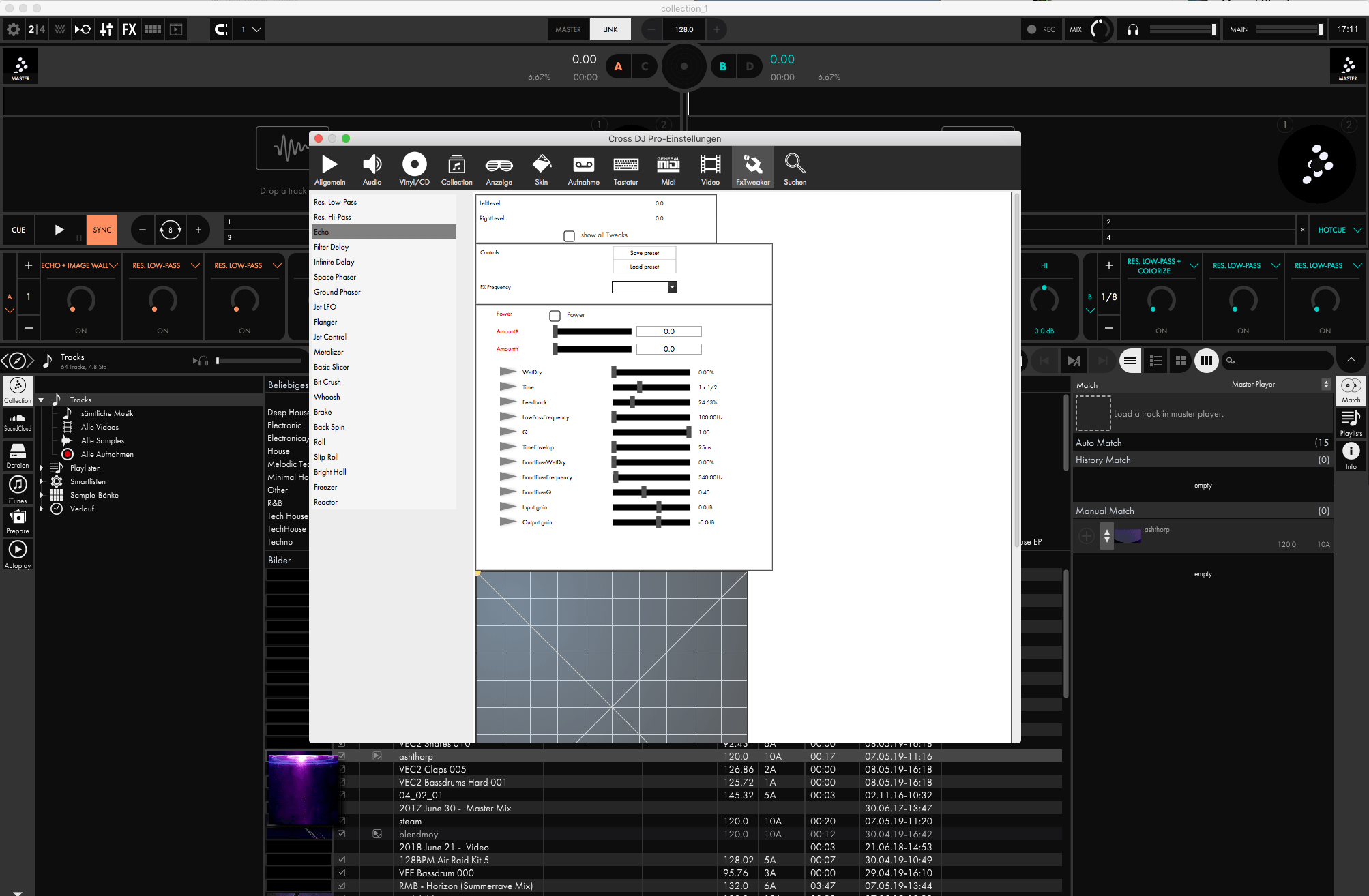 Die Signale aus den Decks können im Mixerbereich mit EQs, ordentlich zupackenden Dualmode-Filtern sowie Fadern und einem Crossfader gemixt werden. Zu beachten gilt, dass der Sampler zwar über separate Fader verfügt, seine Signale aber in den Kanälen der Decks drei und vier eingeschliffen werden. Befinden sich Songs in den Decks drei und vier, erfolgt eine gemeinsame Signalbearbeitung. Pro Deck stehen bis zu drei synchronisierbare Effekte zur Verfügung, die sich aus einer Auswahl von 21 Effekten selektieren lassen. Hier gibt es zahlreiche gut klingende Kombinationen wie „Flanger + Flash“, „Bit Crush + Time Fade“ oder einzelne Effekte wie „Jet Control“, „Freezer“ oder „Echo“. Wer mit den enthaltenen Effekten nicht zufrieden ist, kann im Einstellungsfenster der Software mit dem FxTweaker eigene Parameter-Kombinationen wählen und diese als Effektpresets unter einem selbst gewählten Namen speichern. Das Interface zur Auswahl der Effektparameter ist etwas nüchtern geraten, praktisch ist aber, dass man die Veränderungen in Echtzeit testen kann.