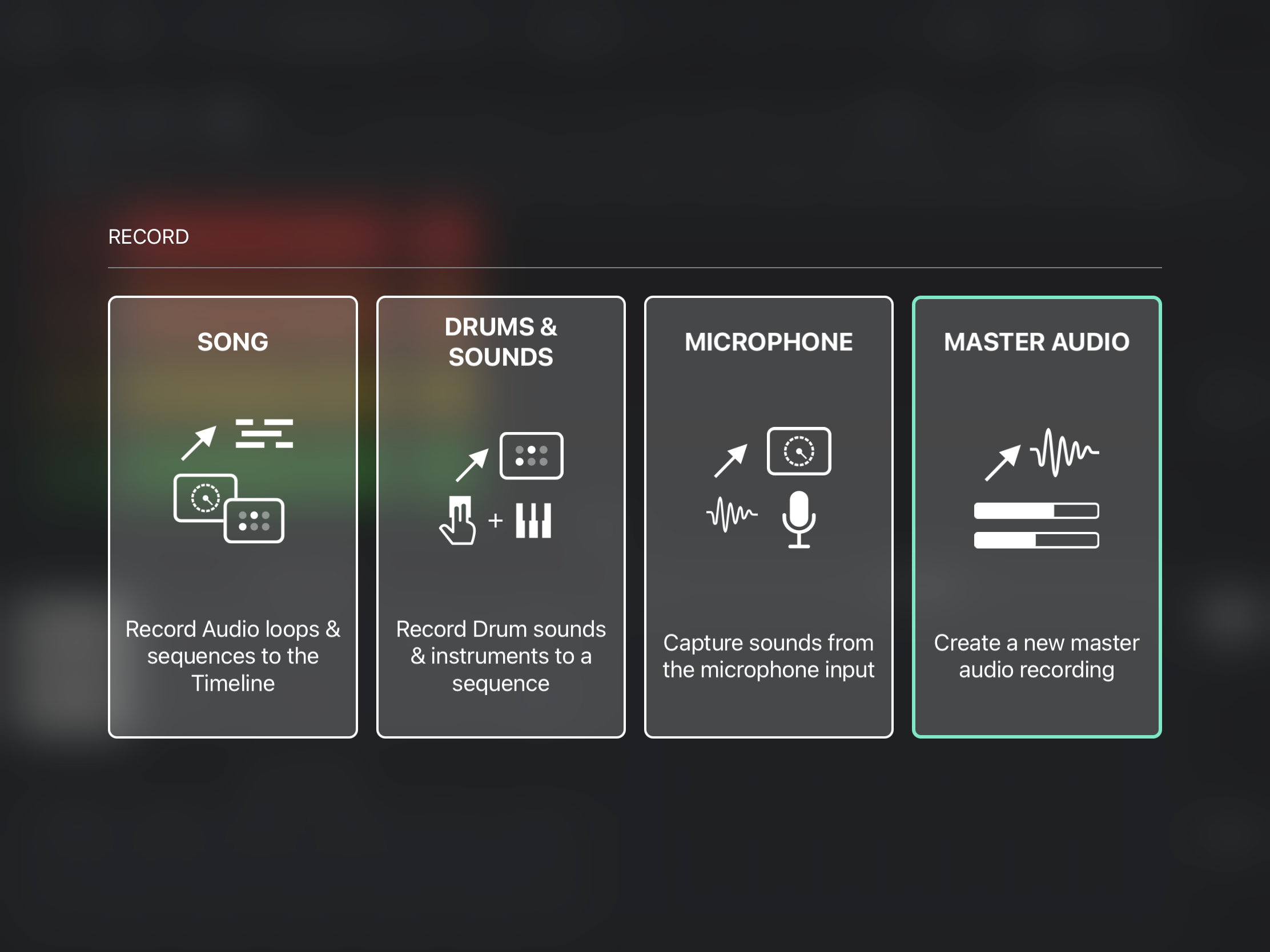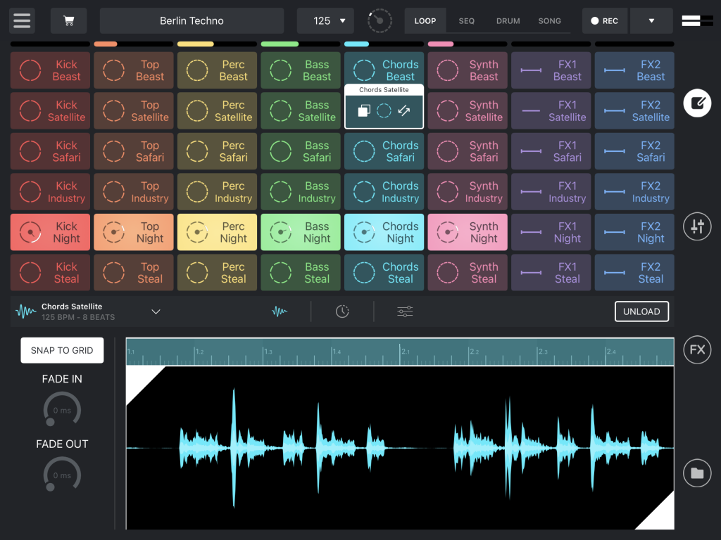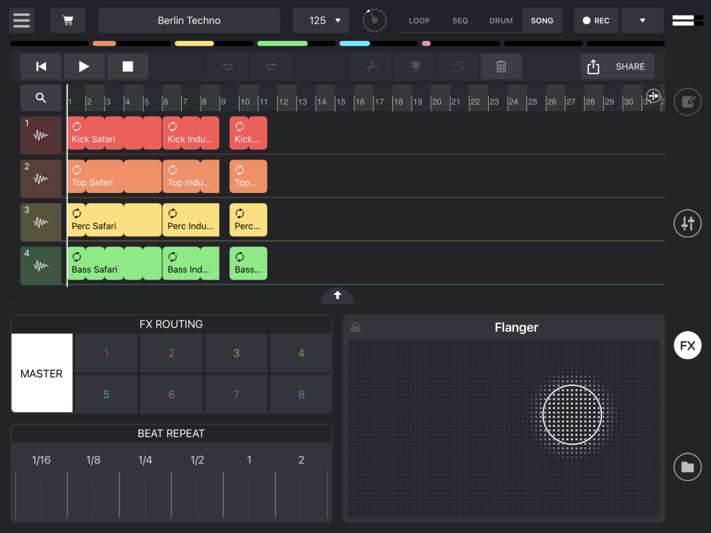 Der Song-Modus ist der jüngste Funktionszuwachs und erweitert die ursprüngliche reine Live-Fokussierung der App. Die Spuren im Song-Modus sind auf einer Zeitleiste angeordnet und lassen sich mit Inhalten aus dem Loop- und Sequenzer-Grid füllen. Die möglichen Parts können aus einem Pool auf der rechten Seitenleiste selektiert und anschließend kopiert, verlängert, verkürzt und horizontal verschoben werden, das Ganze kann einzeln oder per Lasso-Auswahl auch für mehrere Parts simultan erfolgen. Alternativ sind Songs auch mit der Aufnahmefunktion „Song“ kreierbar, die das Starten und Stoppen von Samples im Loop und Sequenzer mitschneidet.