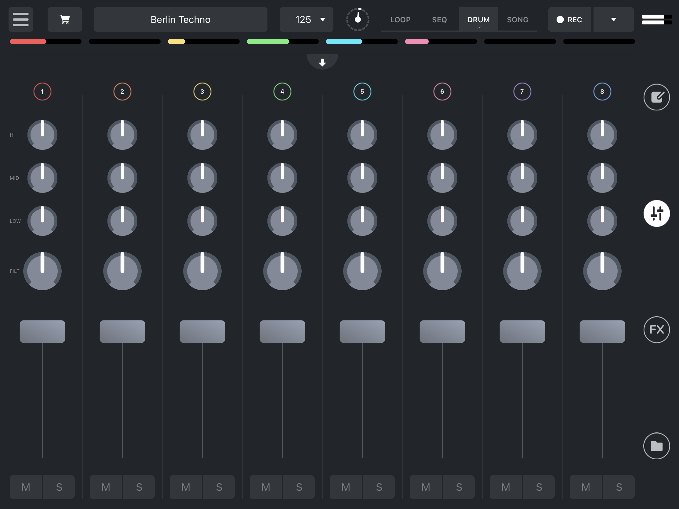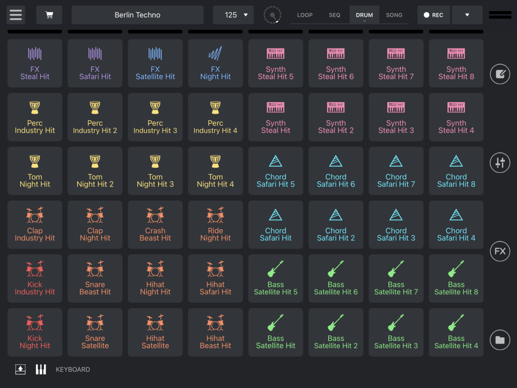 Zur Feinabstimmung der Sounds stehen acht Kanalzüge parat, die durch Tippen auf das Fader-Icon in der Seitenleiste angezeigt werden und jeweils einer Soundkategorie fest zugewiesen sind. Um die Zugehörigkeit eines Samples zu einer Soundkategorie überprüfen zu können, findet eine Einblendung unterhalb der Kopfzeile statt, wenn ein Sample wiedergegeben wird.