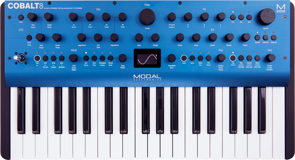 Der britische Hersteller Modal Electronics erweiterte Ende 2020 sein Portfolio um den virtuell analogen Cobalt8 Synthesizer. Modal bietet drei verschiedene Bauformen beim Cobalt8, die beiden Keyboard-Versionen mit 37 oder 61 Tasten sowie ein tastaturloses Desktop-Modul. Neben den Wellenformen analoger Synthesizer, die die Basis bilden, verfügt der neue Modal Klangerzeuger über 34 Algorithmen, was ein weites Klangspektrum ermöglicht. Wie der Produktname schon vermuten lässt, handelt es sich beim Cobalt8 um einen achtstimmigen, polyphonen Synthesizer. Zusätzlich zur neuen Oszillator-Engine besitzt der Cobalt8 über ein neues morphbares 4-Pole Ladder-Filter mit vier unterschiedlichen Modi. In unserem Test schauen wir uns diese sowie weitere interessante Features einmal genauer an.