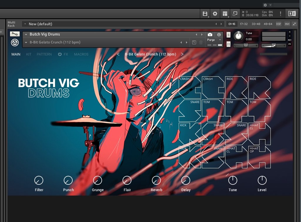 Vier neue Libraries erweitern zusätzlich die Play Series. Butch Vig Drums besteht aus 21 Drum-Kits und jedes Kit wiederum aus 16 Sounds und 16 kompletten Grooves. Ab C1 der Keyboard-Tastatur stehen einem die einzelnen Drum-Sounds eines Kits zur Verfügung und ab C3 findet man dann die eingespielten Grooves. Hinzu kommt eine ausgeklügelte Effekt-Sektion mit Insert-, Send- und Global-FX. Alle Kits wurden damit auch ziemlich stark bearbeitet, deshalb klingen sie schon sehr gut, ein weiterer Einsatz von Effekten dürfte dann nicht unbedingt nötig sein.