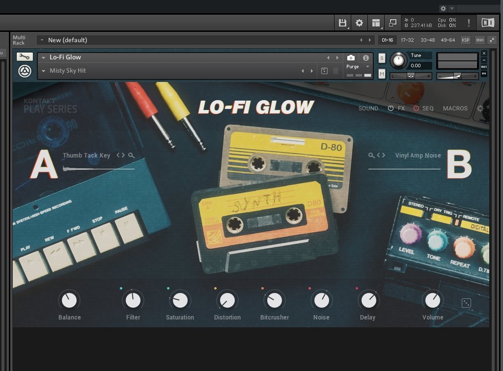 Lo-Fi Glow ist nach dem gleichen Prinzip aufgebaut – zwei Sounds ergeben ein Preset, Effekte en masse, ein Sequenzer und Zufallsgenerator. Hier dreht sich alles um Lo-Fi-Sounds, inklusive Bit-Raten-Reduktion und Plattenknistern. Die Sounds wirken auf Anhieb inspirierend, da bekommt man direkt Lust, einen Beat zu bauen.