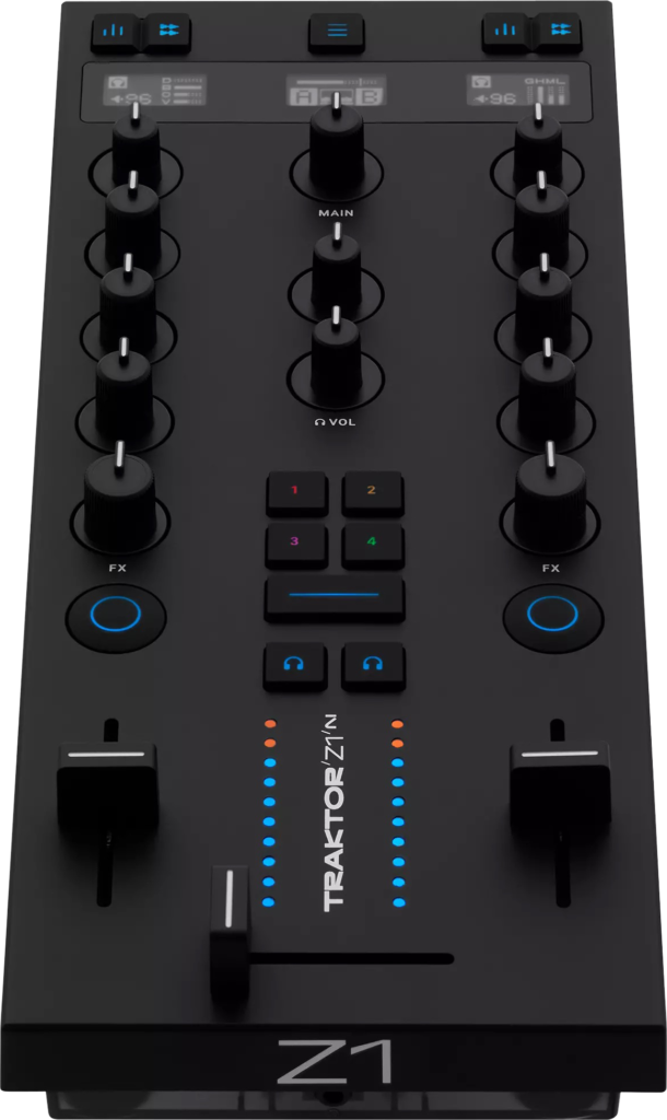 Die Bedienoberfläche des Traktor Z1 MK2 bietet zwei Kanalzüge mit Gain- und EQ-Reglern, die alternativ auch zur Steuerung von Stems genutzt werden können. Hinzu kommen FX-Regler mit Aktivierungsschaltern sowie Kanalfader und ein Crossfader. Zwischen den beiden Kanalzügen befinden sich Bedienelemente zur Steuerung der Master- und Cue-Signale sowie beleuchtete Taster zur Effekt- und Filterauswahl.