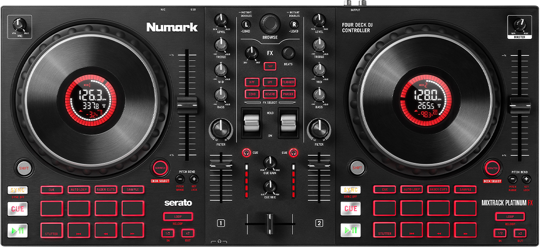 DJ-Spezialist Numark hat die Einsteiger-Controller-Serie Mixtrack überarbeitet und schickt die Auflegewerkzeuge Mixtrack Pro FX und Mixtrack Platinum FX ins Rennen. Beide Controller sind zur Steuerung von Serato DJ Lite ausgelegt und haben das gleiche Layout. Mixtrack Pro FX kontrolliert zwei Decks, sein größerer und etwas teurerer Bruder Mixtrack Platinum FX dagegen vier und bietet zudem Jogwheels mit Displays. Ich habe mir den Mixtrack Platinum FX für diesen Test genauer angeschaut und berichte, ob er sich in der Praxis bewährt.