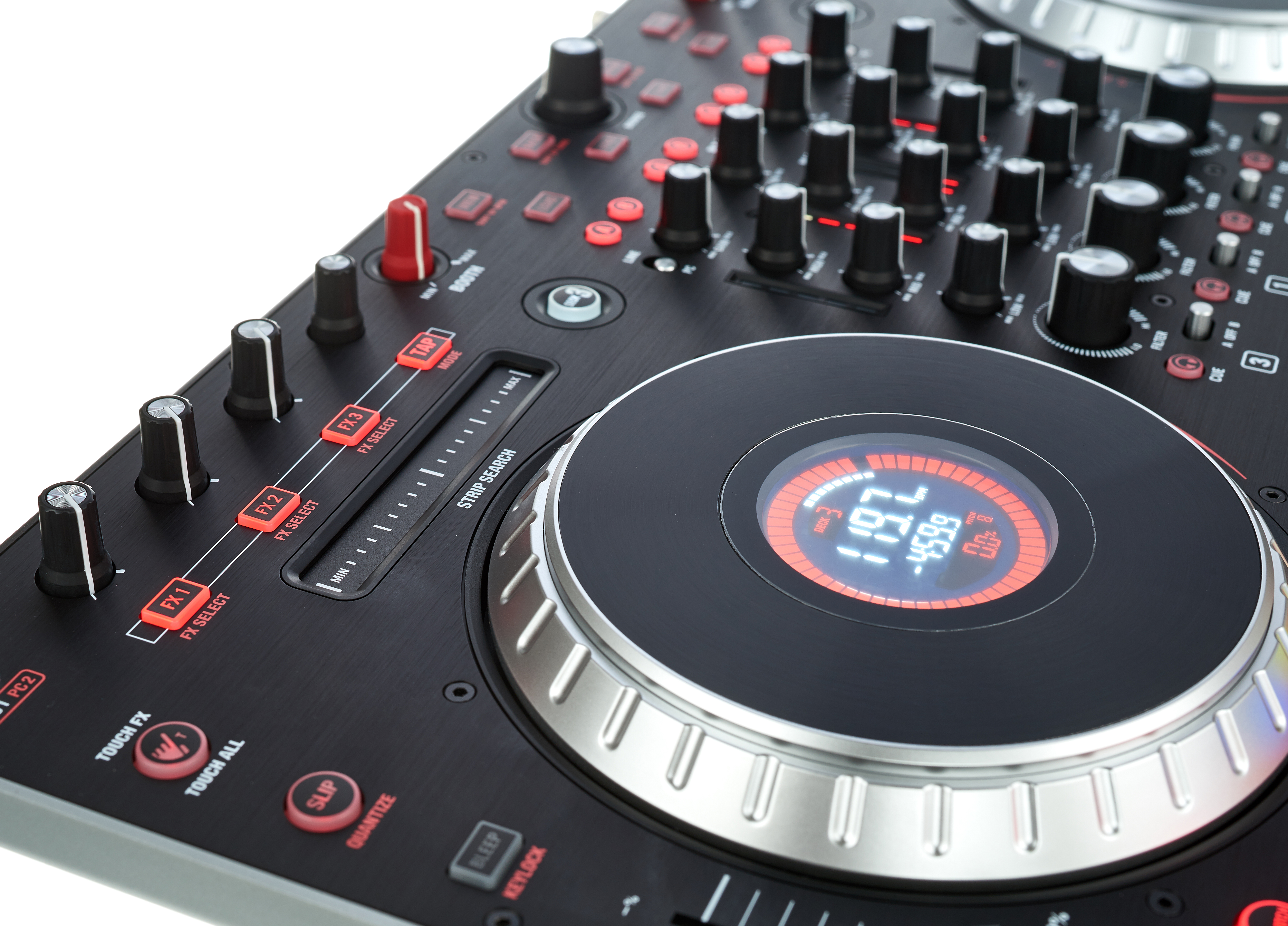 Wie bei den meisten 4-Deck-Controllern ähnelt die Mixer-Sektion der Ausstattung eines regulären DJ-Mischpultes. Pro Kanalzug stehen ein Gain, ein 3-Band Kill-EQ, eine Vorhörtaste und ein großer bipolarer Filterregler zur Verfügung. Die Kanalfader sind 45 mm lang und können der jeweiligen Crosssfaderseite zugeordnet werden. Die Linefader und der Crossfader sind leichtgängig und messen einen Faderweg von 45 mm. Der Crossfader besitzt eine separate Frontplatte und kann dementsprechend von der Oberseite herausgenommen werden. Sein Cutlag misst auch nach stufenloser Scharfstellung ca. 2 mm, was fürs Scratchen nicht ganz optimal ist. Zur optischen Überwachung des Pegels steht pro Kanal eine kleine Volume LED-Kette aus fünf Segmenten zur Verfügung, welche rot bzw. in der Spitze weiß leuchtet. Zusätzlich gibt es mittig auch noch eine Master Volume LED-Kette, um das Gesamtsignal zu überwachen.