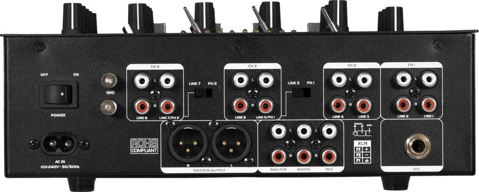 Auf der Rückseite des Mixers befinden sich sechs Line- und zwei kombinierte Line-/Phono-Anschlüsse, sodass man einen recht großen Gerätepark bequem verkabeln kann. Zur Ausgabe des Mastersignals gibt es symmetrische XLR- und unsymmetrische Cinch-Buchsen, wodurch eine Verkabelung mit einer PA möglich ist. Ergänzend findet man einen Cinch-Booth-Ausgang zur Speisung einer Monitorbox und ein Recording-Ausgang für analoge Mitschnitte. Wer ein Mikrofon ergänzen möchte, kombiniert dieses entweder mit der unsymmetrischen Klinkenbuchse auf der Rückseite oder mit der symmetrischen XLR-Buchse auf der Vorderseite. USB-Anschlüsse für Computer, Netzwerkbuchsen oder digitale Audioausgänge gibt es nicht.