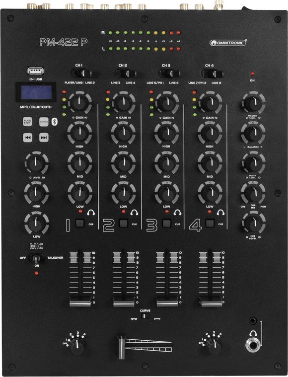 Omnitronic hat dem PM-422 P einen digitalen Player spendiert, der mit einem USB-Port und einer Bluetooth-Schnittstelle ausgestattet ist. Ihr könnt an diesen Sticks mit bis zu 32 GB anschließen und MP3-, WMA- und WAV-Dateien wiedergeben oder Musik von einem mobilen Gerät oder Computer drahtlos an den Mixer senden. Der Player kann Songs starten und stoppen und bietet zwei Navigationstaster zur Track-Selektion. Die Auswahl der Songs von einem USB-Datenträger ist dabei wenig komfortabel, da man lediglich vor- und zurückblättern kann. Eine Auswahl von Ordnern etc. ist nicht möglich, es ist daher ratsam, Datenträger mit wenigen Tracks zu verwenden.