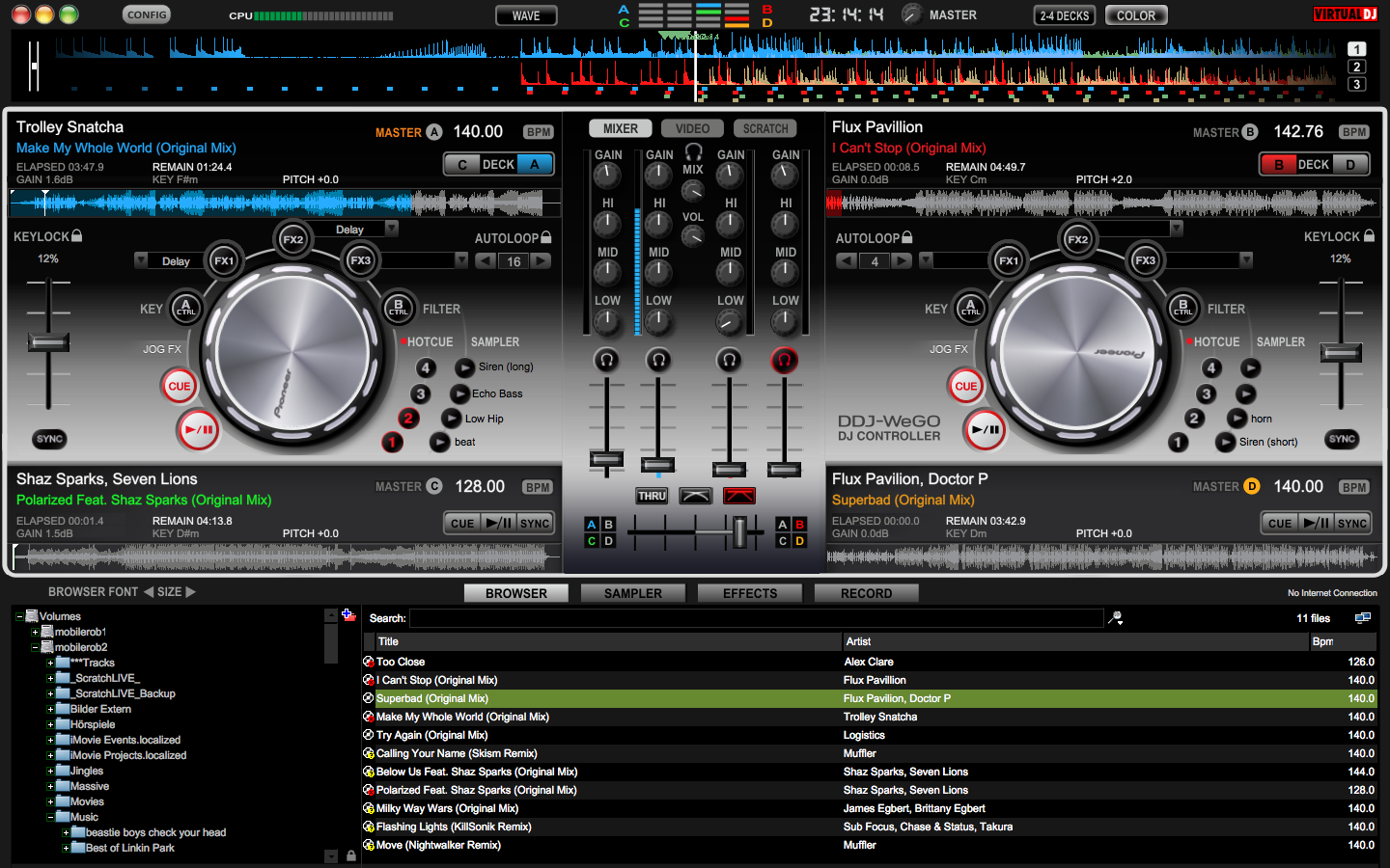DDJ-WEGO wird mit einer eigens für den Controller zugeschnittenen LE-Version von Virtual DJ ausgeliefert. Die Installation ist einfach und die Einstellmöglichkeiten des Software Setup sind auf die Soundkartenparameter begrenzt. Das erlaubt ein einfaches Anschließen mit sofortigem Spielvergnügen. Die Oberfläche dieser LE-Version ist optisch an WEGO angepasst und darüber hinaus kann man auch hier noch nachträglich die Farbe für Faceplate und Jogwheel in der Software auswählen, damit alles zu 100% aus einem Guss kommt. Neben diesen optischen Spielereien gibt es aber auch sehr viel Funktionales. Virtual DJ LE bietet ja generell schon als Bundlesoftware eine Menge Features, die man bei anderen Softwares erst in der Vollversion erwarten kann.