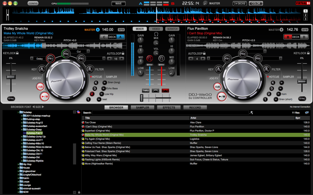 DDJ-WEGO verfügt über alle essentiellen Funktionen um die Basics fürs digitale Auflegen zu erfüllen. Das Navigieren in der Tracklist kann genau so gut durchgeführt werden, wie das Browsen im Tree (Explorer). Dank der Shift-Taste hat man hier eine sinnvolle Doppelfunktion des Browse-Encorders. Nach der Auswahl des Tracks kann man diesen dann direkt in das Deck laden. Darauf folgend analyisiert VDJ sofort die BPM und Wellenformdarstellung. Da WEGO über keine Gainregler verfügt, sollte man in der Software (im Deck) die Autogainfunktion aktiviert haben, da man sonst während des Mixings gezwungen wäre die Lautstärkenangleichung mit der Mouse zu machen. Übergänge können sowohl manuel eingepitcht werden oder per Sync-Funktion angeglichen werden. VDJ LE hat hier im Test auch bei stark komprimierten Tracks einen guten Job gemacht. Das normale Cueing mit dem Jogwheel funktioniert ebenfalls problemlos. Kleinere Latenzen zeigen hier aber, dass WEGO nicht zum Scratchen geeignet ist. Aber für solche Spezialfälle ist WEGO auch nicht konzipiert. Das Arbeiten mit Hot-Cues und Loops erweist sich genauso problemlos wie das Einspielen von Samples über den integrierten Sampler. Zu guter letzt bietet VDJ LE auch eine Recording-Funktion an, um den eigenen Mix auf der Festplatte zu speichern.