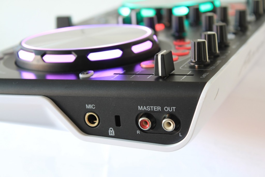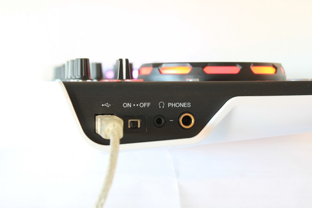 Anders als bei vielen Controllern auf dem Markt, befinden sich die Anschlüsse für die USB-Datenübertragung, Kopfhörer und dem Master Out auf den Seiten. In erster Linie hat das den Vorteil, dass man die Konsole kopfseitig direkt an den Laptop oder anderes Equipment stellen kann ohne abgehende Kabel dabei knicken zu müssen. Zum anderen würden bei dieser Neigung der Bedienoberfläche die Anschlüsse auf der Vorderseite wahrscheinlich nur in Konflikt mit der Abstellfläche kommen. Bei Platzverhältnissen, bei denen jeder Zentimeter zählt, kann das schon entscheidend für das DJ-Wohlgefühl sein. Kopfhöreranschlüsse gibt es als Mini- und normale Klinke und der Master Out steht als Cinch zur Verfügung.