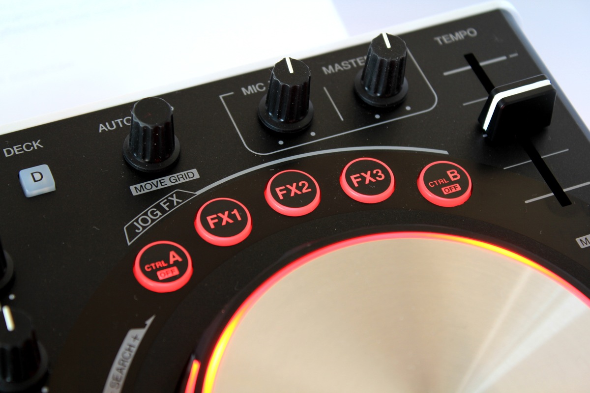 Neben der Unterstützung von Video, einem Sampler und dem Spielen mit insgesamt vier Decks bekommt im Zusammenspiel mit WEGO auch die Effektsteuerung eine andere Bedienungsform. Sobald ein Effekt mit einer der drei Tasten oberhalb des Jogwheels aktiviert wird, dient das Jogwheel selbst als Dry/Wet Regler, d.h. man steuert durch Drehung des Wheels den Effektanteil im Kanal. Die Scratch- oder Pitchbend-Funktion wird während dieses Vorgangs deaktiviert. Der Effektanteil bzw. die Position des Reglers in der Software bleibt auch nach dem Wechseln des Effektes gespeichert. Einen direkten Reset gibt es auch per Shift-Taste nicht, was zu Folge hat, dass man vor jedem neuen Übergang den Regler manuel zurückdrehen muss, um nicht direkt mit dem letzten Status arbeiten zu müssen. Neben den drei Effekten pro Deck lassen sich auch ein Low/Highpass Filter und die Tonhöhe mit dem Jogwheel steuern. Letzteres läßt sich bei dieser Bedienungsart wunderbar nutzen um selbst kreierte Sweeps oder Turndowns für individuelle Übergänge zu produzieren.