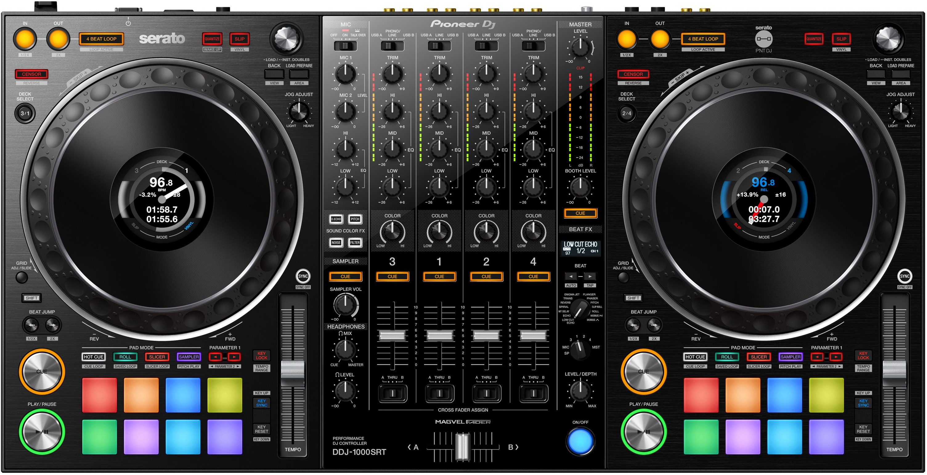 Die beiden großzügig dimensionierten Decks des sehr gut verarbeiteten Geräts sind mit imposanten 20-Zentimeter-Jogwheels ausgestattet, deren Drehwiderstand anpassbar ist. In der Mitte der Wheels befinden sich Farbdisplays, die den Nutzer mit mixrelevanten Zeit- und Tempoinformationen versorgen. Die Bedienelemente in den Decks sind sinnvoll platziert, haben eine ansprechende Haptik und erlauben eine treffsichere Funktionssteuerung. Neben Transporttasten gibt es spezielle Taster zur Aktivierung von Loops, Beat Jump sowie der Quantisierungs- und Slip-Funktion. Fader mit einem langen Regelweg von zehn Zentimetern erlauben Tempomodifikationen, und auch Tonart-Anpassungen sind per separater Taster möglich. Wichtig für Performance-DJs: Der DDJ-1000SRT bietet pro Deck acht mehrfarbig beleuchtete Pads, die zur Kontrolle der kreativen Funktionen in Serato DJ Pro dienen.
