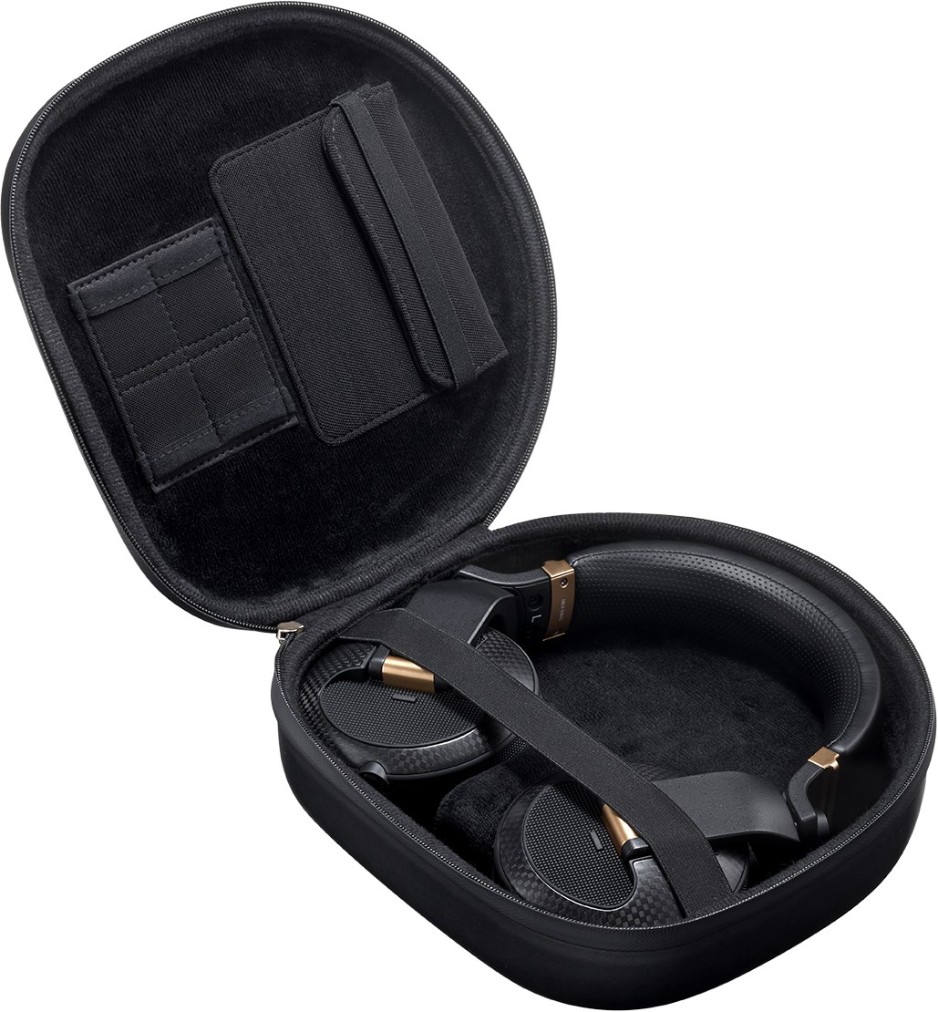Durch das Carbon an den Ohrmuscheln und an Teilen der Bügel sowie der Details in Roségold wirkt der Pioneer DJ HDJ-X10C sehr edel und elegant. Er wird in einer schicken Verpackung und einem praktischen Transportkoffer geliefert. Der Transportkoffer ist gut gepolstert und stabil, sodass der Kopfhörer im Reiseeinsatz keinen Schaden nimmt. Pioneer DJ hat zwei Anschlusskabel beigelegt, die sich für unterschiedliche Einsätze eignen. Es gibt ein starres Kabel mit einer Länge von 1,6 Metern für die Nutzung im Studio oder Heimbereich und ein 1,2 Meter langes Spiralkabel, das sich auf stattliche drei Meter dehnen lässt, für DJ-Einsätze. Beide Kabel sind mit 3,5-Millimeter-Klinkensteckern ausgestattet und können per mitgeliefertem Schraubadapter auf 6,3 Millimeter vergrößert werden.