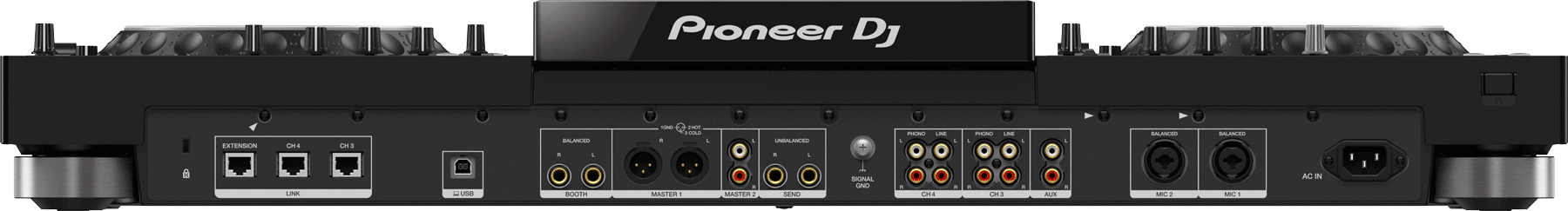 Zwei Combo-Anschlüsse dienen zur Verkabelung von Mikrofonen und drei Netzwerkbuchsen erlauben den Anschluss von DJ-Link-fähigen Pioneer-DJ-Playern und Computern. Eine USB-Typ-B-Buchse ermöglicht den Datenaustausch mit Windows- und Mac-Rechnern sowie die Steuerung von Rekordbox DJ und Serato DJ Pro.