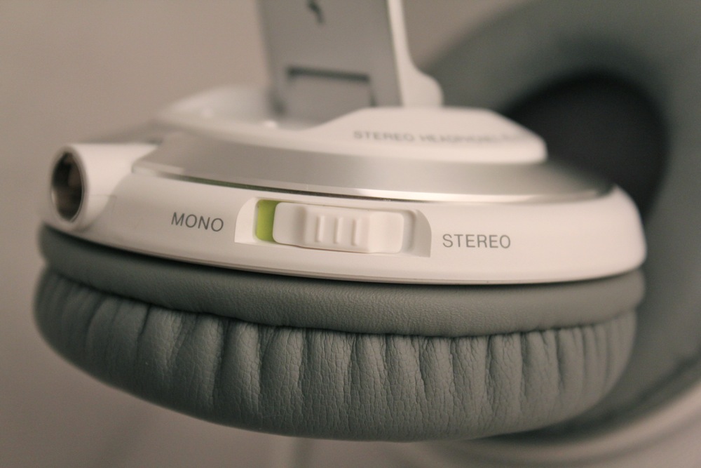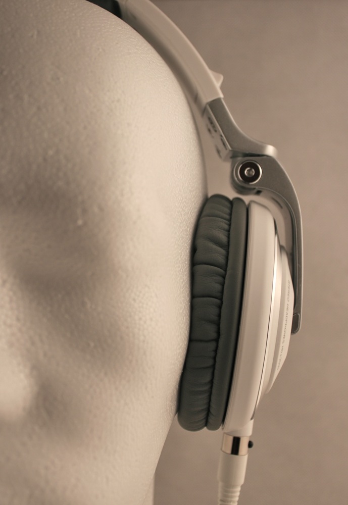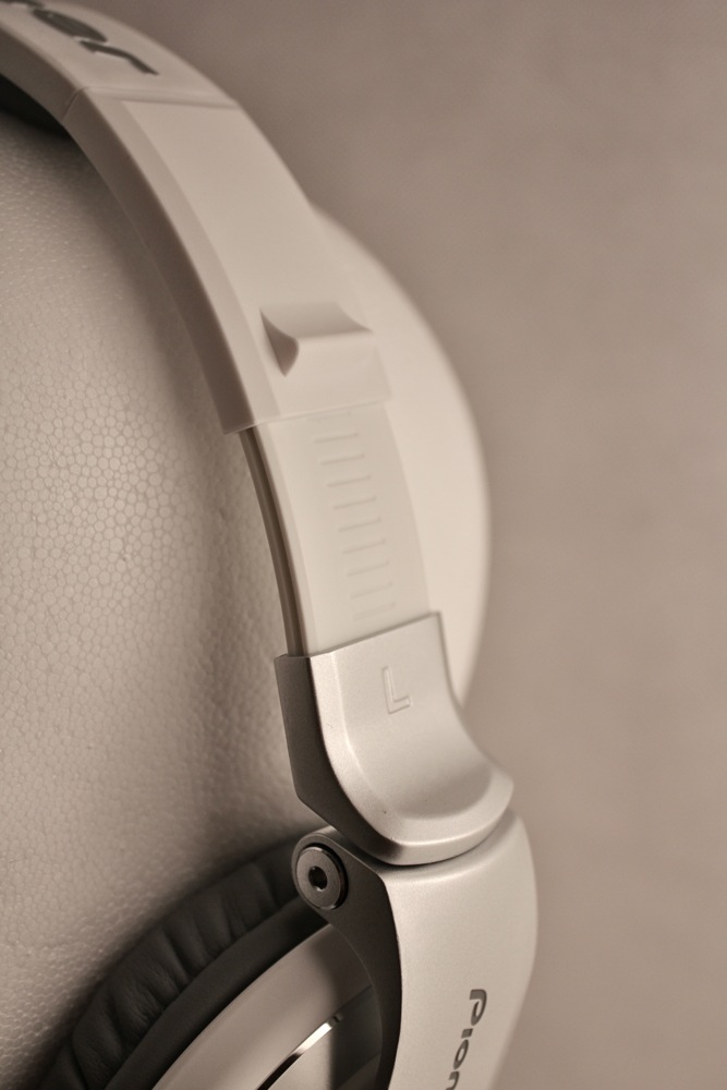 Der Bügel des HDJ-2000 besteht zum größten Teil aus Kunststoff. Das Kabel ist zu 100% verdeckt geführt und schaut an keiner Stelle raus. Die Ohrmuscheln sind auf 2 Gelenken gelagert, welche den Kopfhörer an den Kopf anschmiegen. Ein drittes Gelenk dient zum Einklappen des Kopfhörers, um ihn für den Transport besser verstaubar zu machen. Ein zusätzliches Gelenk zum wegklappen einer Kopfhörerseite ist nicht vorhanden. Die Ohrpolster sind aus Kunstleder und mit einem sehr weichen, anschmiegsamen Memoryschaum gefüttert. Ersatzpolster aus z.B. Velour, gibt es nicht im Lieferumfang. An der linken Kopfhörermuschel befindet sich ein Stereo-Mono-Schalter. Gleich daneben ist der 3-polige Kopfhörerkabelanschluss mit Arretierung. Das mitgelieferte 1,2m lange Spiralkabel lässt sich bis auf 3m strecken und besitzt einen schraubbaren Klinkenadapter. Trotz der 50mm Treiber macht der HDJ-2000 dank des Designs eine schlanke Linie, die sich sehen lassen kann.