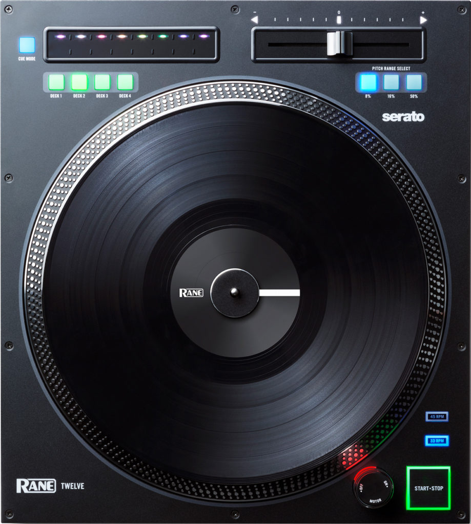 Der Twelve Controller verfügt neben den üblichen Reglern eines Turntables wie z.B. Start-Stop-Taster, Drehgeschwindigkeit, Pitchfader und Pitchbereich über Deckauswahltasten, mit denen bis zu vier Decks angesteuert werden können. Darüberliegend gibt es einen Touchstrip, mit dem sich wahlweise durch einen Track scrollen lässt oder Cue-Punkte angesteuert werden können. Die Cue-Punkte werden dank der RGB-LEDs farblich angezeigt. Der lange Pitchfader liegt bei normaler Aufstellung des Geräts oben rechts in der Waagrechten, so wie Scratch-DJs es gewohnt sind, wenn sie ihre Turntables im Battlemode aufstellen, um nicht in den Tonarmbereich zu kommen.