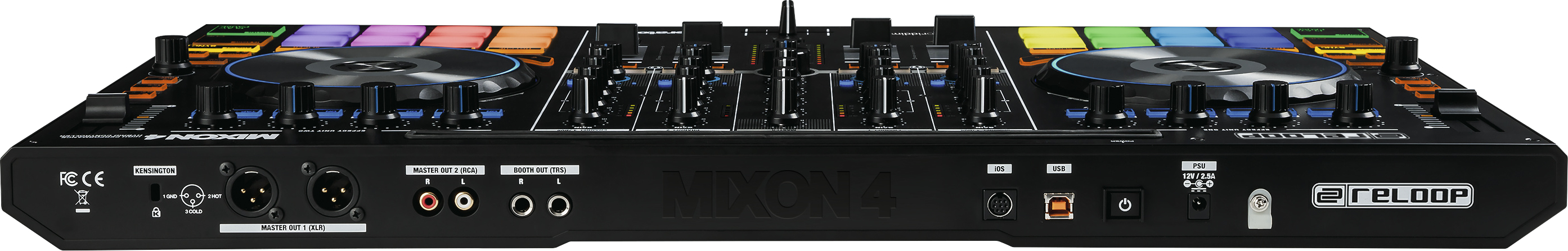 Der Reloop Mixon 4 bietet auf der Geräterückseite Audioausgänge und digitale Kommunikations-Ports, auf Line- oder Phono-Eingänge hat der Hersteller verzichtet. Zur Ausgabe des Mastersignals stehen symmetrische XLR- und unsymmetrische Cinch-Buchsen parat und das Monitorsignal verlässt den Controller per Klinkenbuchsen. Prima: Ein direkter Anschluss des Mixon 4 an eine PA ist hierdurch möglich. Den Datenaustausch mit einem Windows- oder Mac-Computer übernimmt eine USB-Buchse, ein beiliegendes Adapterkabel ermöglicht zudem die Verbindung mit einem Android-Gerät. Eine weitere Buchse dient zur Kombination des Controllers mit einem iOS-Gerät, das hierrüber gleichzeitig geladen wird.