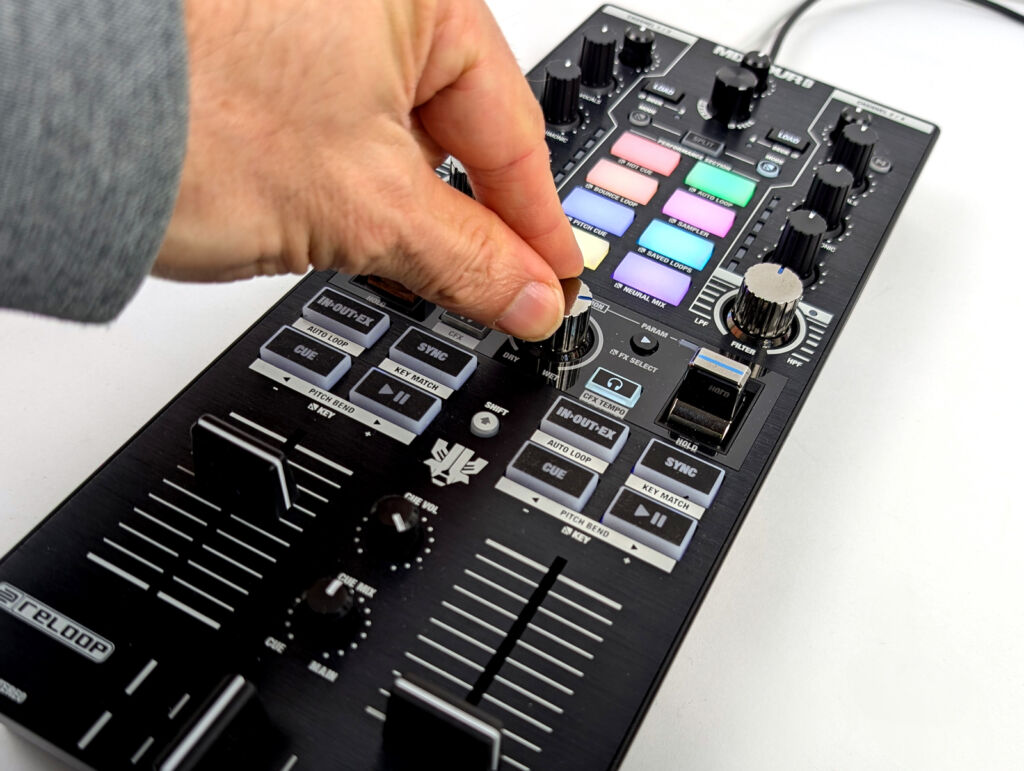 Sollte der Pegel zu hoch oder zu niedrig sein, kann man mit einem Gain-Regler gegensteuern. Die Fader des Reloop Mixtour Pro lassen sich gut dosieren und der in der Software einstellbare Crossfader ist für das smoothe Überblenden oder schnelle Cuts nutzbar. Zur Klangformung während eines Mixes stehen Dreiband-EQs und Filter bereit, auch hier sind Anpassungen in der Software möglich.