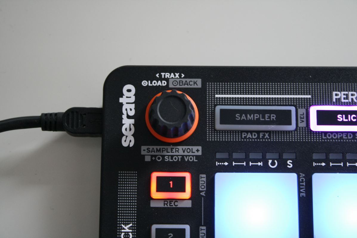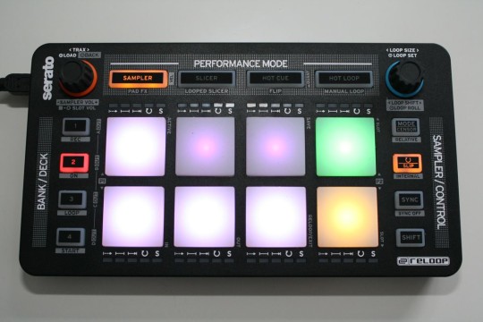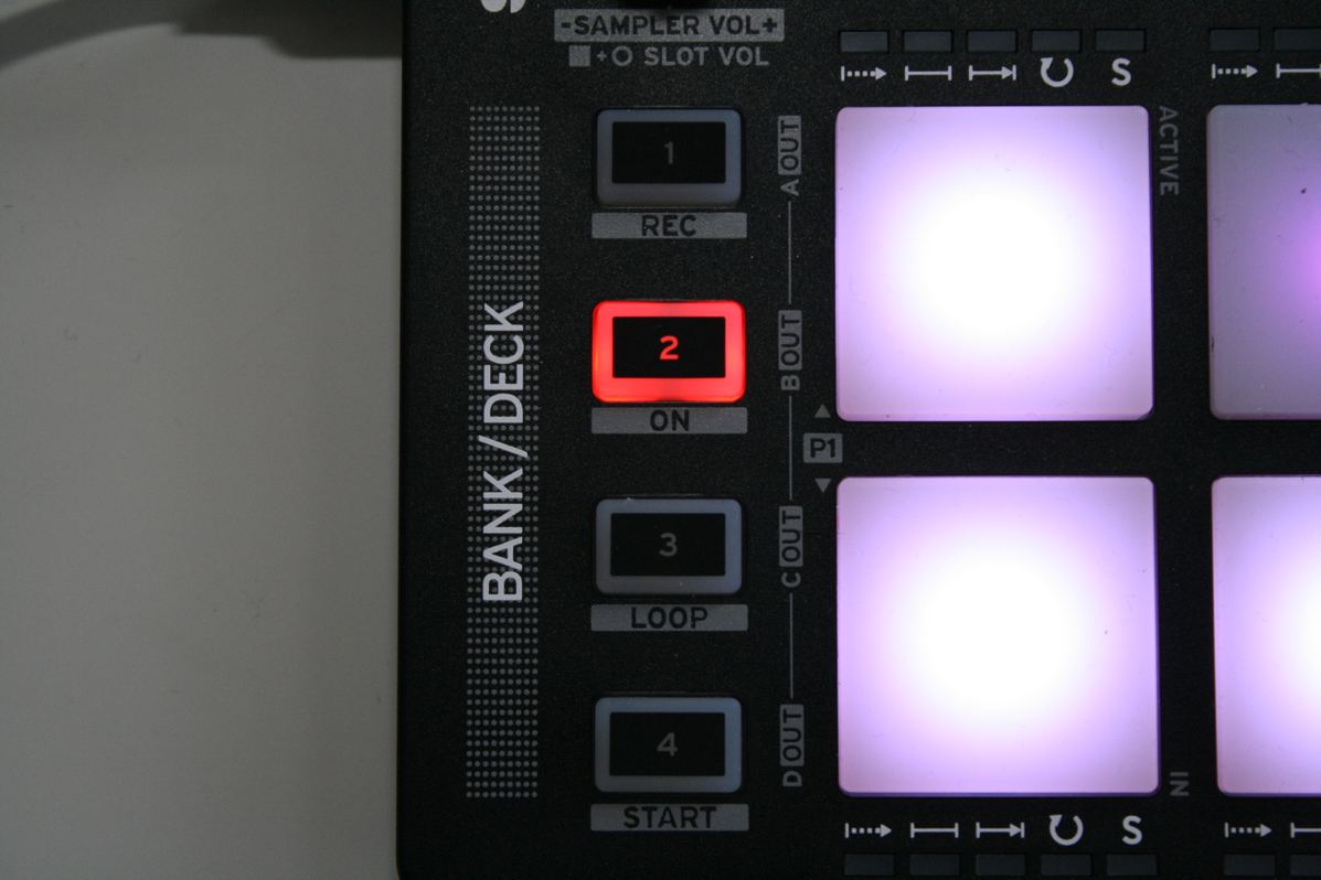 Die Funktionszuweisung der Pads findet mit Tasten statt, die direkt oberhalb der Pads angeordnet sind. Ein Encoder erlaubt die Navigation in der Songsammlung, das Laden von Songs und die Steuerung der Sampler-Lautstärke. Ein weiterer Encoder dient zum Setzen von Loops und für Loop Rolls.