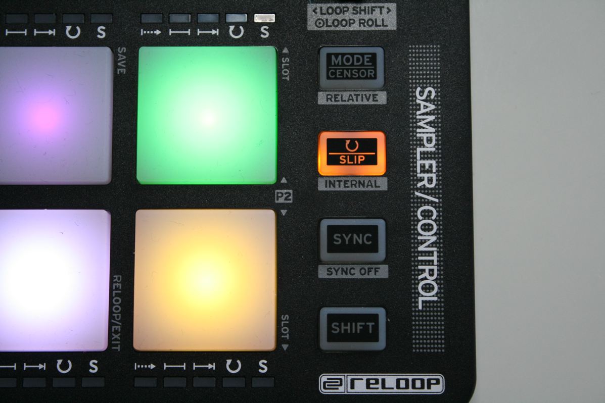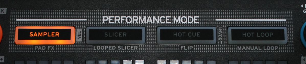 Links neben den Pads gibt es eine Tastreihe, die zum Umschalten der Sample-Bänke und der Decks dient. Auf der rechten Seite des Controllers lassen sich unterschiedliche Sample-Wiedergabeoptionen selektieren und der DVS-Modus auswählen, wenn das System per Control-Medien gesteuert wird.