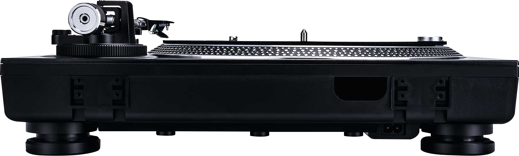 Weiterhin gibt es noch einen 11 cm langen Pitchfader mit Mittenrastung, eine ausklappbare Nadelbeleuchtung und den im 1210er Stil gehaltenen Ein- und Ausschalter, der zugleich das Kalibrierungslicht für den Plattenteller enthält. Der Tonarm mit SME-Anschluss ist aus einem Hochglanz-Aluminium und sitzt auf einer Tonarmbase mit Armlift und Antiskating. Die Tonarmbase selbst ist nicht in der Höhe verstellbar, auch wenn die Zahnradoptik hier erst einen anderen Eindruck vermittelt. Dazu kommt, dass die Tonarmlagerung ein wenig Spiel aufweist, welches sich akustisch durch ein Klackern beim Ziehen am Tonarm bemerkbar macht. Normalerweise ist das nichts Unbekanntes unter OEM-Plattenspielern, jedoch war bei meinem Testgerät eine Nachjustierung mit Feinwerkzeug erfolglos. Der RP-1000 MK2 steht auf nicht höhenverstellbaren Kunststofffüßen, die mit einer Dämpfung versehen sind, um so Vibrationen auffangen zu können.