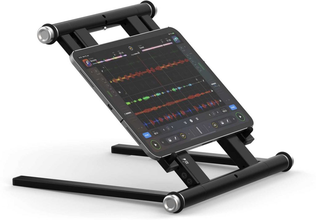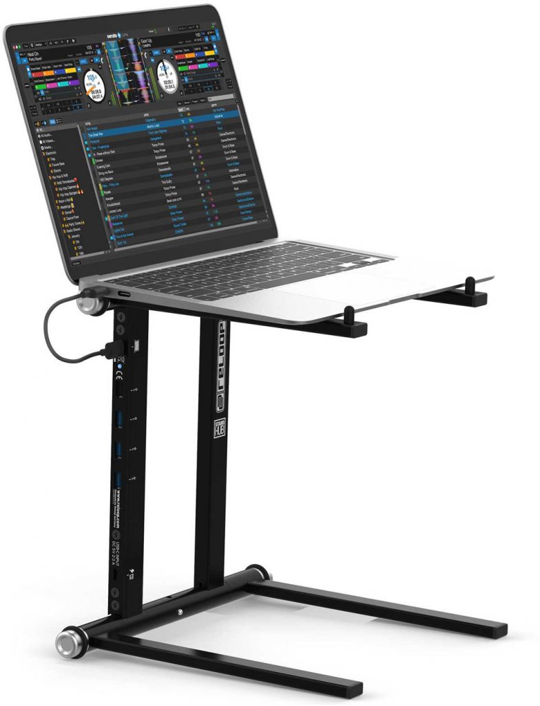 DJ-Spezialist Reloop erweitert seine Laptop-Ständerauswahl um das komplett aus Metall gefertigte Modell „Stand Hub“, das mattschwarz gehalten ist. Der Ständer wird mit einer Transporttasche ausgeliefert, misst im reisefertigen Zustand 30 x 29 x 2,8 cm und wiegt 1,4 Kilogramm. Neben der Tasche befinden sich gummierte Klebestreifen im Lieferumfang, die als Schutz vor Kratzern auf die Positionierarme geklebt werden, und zwei Sicherungspins.