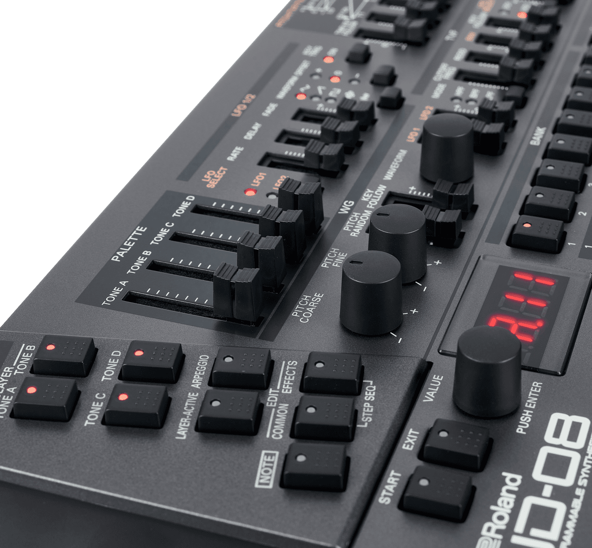 Rolands JD-08 kombiniert pro Patch vier Layer bzw. Tones zu einem Gesamtklang. Ähnlich wie bei Wavetablesynths dienen kurze PCM-Samples als Klangerzeuger, wobei jeder Tone eine eigene Wellenform spielen kann. Das Lautstärkeverhältnis dieser Tones lässt sich über die vier Palette-Slider regeln und per LFO und Co. modulieren. Anhand der angeschrägten Taster oben links am Gerät wird das aktive Layer angezeigt bzw. ausgewählt und kann dann mit den vielen Bedienelementen des JD-08 justiert werden.