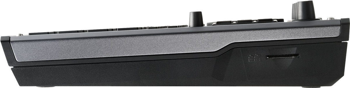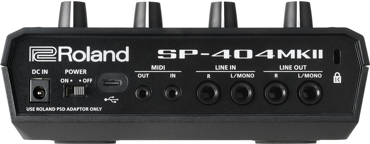 Ein Power-Schalter, der Eingang fürs Netzteil und eine Kensington Diebstahlsicherung runden die rückseite Anschlusssektion ab. Zwei Kopfhörerausgänge – einmal 6,3 mm und einmal 3,5 mm – wurden zugunsten des Kabel-Managements an der Vorderseite des Geräts untergebracht. Direkt daneben befinden sich der 6,3mm-Klinkeneingang für externe Signale sowie ein Kippschalter für die Eingangsempfindlichkeit plus dediziertem Gain-Regler. Zu guter Letzt haben Roland noch einen SD-Kartenslot an der rechten Flanke des SP-404MKII integriert und ein Batteriefach für sechs AA-Batterien an der Unterseite verbaut.
