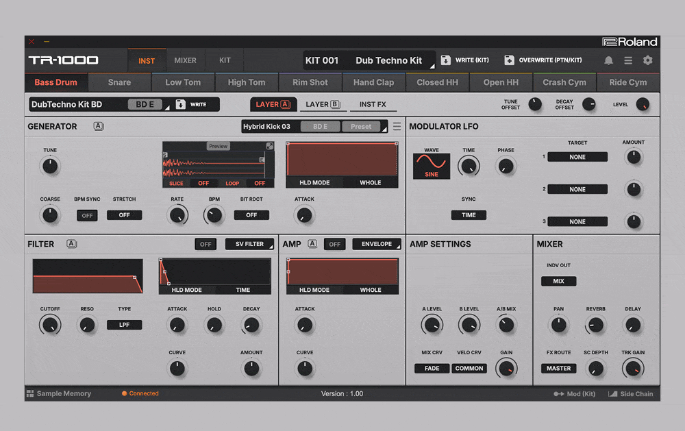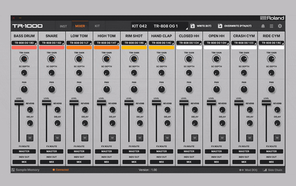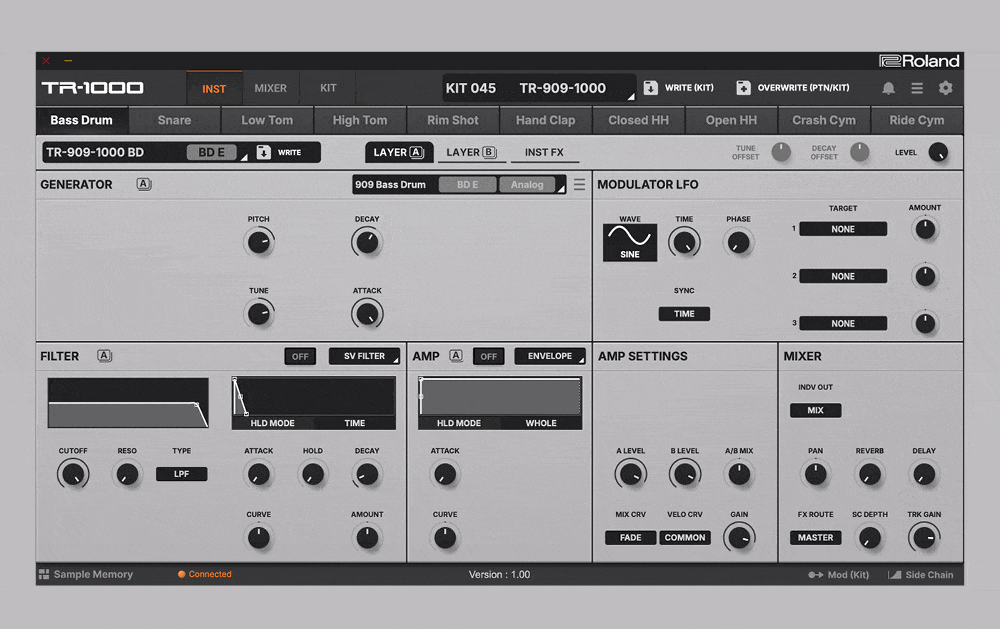 Zur Verfügung stehen 16 analoge Instrumente aus TR‑808 und TR‑909, die neu abgestimmt wurden und zusätzliche Parameter erhalten haben, wodurch bereits der Grundklang nuancierter ausfällt. Besonders positiv im Hörtest aufgefallen sind die TR‑1000‑Varianten der Kick‑Drums, welche für spürbar mehr Druck sorgen als die klassischen Vorbilder. Die analogen Schaltungen lassen sich aufgrund ihrer physischen Limitierung je Kit pro Typ nur einmal nutzen, eine zweite identische Analog‑Instanz kann bei Bedarf aber digital (etwa ACB, PCM oder Sample) ergänzt werden.
