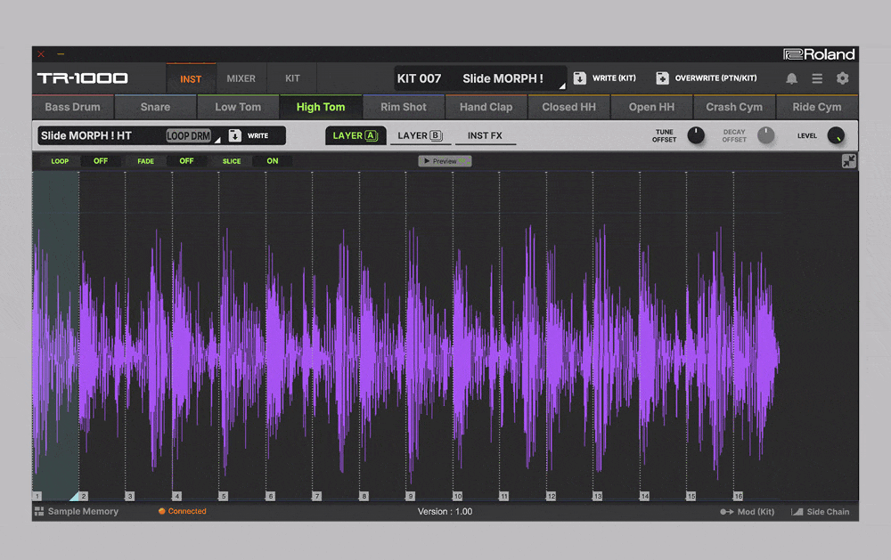 Mit der neuen Sampling‑Engine erhalten nun auch Loops und eigene One‑Shots, inklusive Time‑Stretching und nicht‑destruktivem Slicing, einzug in die TR-1000. Die Werksbibliothek liefert somit eine solide Basis mit umfangreicher Sound-Auswahl, während insgesamt 64 GB interner Speicher bereitstehen, wovon etwa 46 GB frei für eigene Samples und Aufnahmen bei 16 Bit / 48 kHz nutzbar sind. So reicht die Bandbreite des TR-1000 von vertrauten TR‑Sounds über moderne Varianten bis zu dichten Layer‑Kits, wobei wirklich jedes Instrument eine hervorragende Soundqualität bietet. Nutzende, denen das noch nicht ausreicht, können die Werksbibliothek einfach durch eigene One-Shots vom Computer erweitern oder externe Loops direkt am Gerät aufnehmen – damit sollte wirklich jeder den passenden Sound finden.