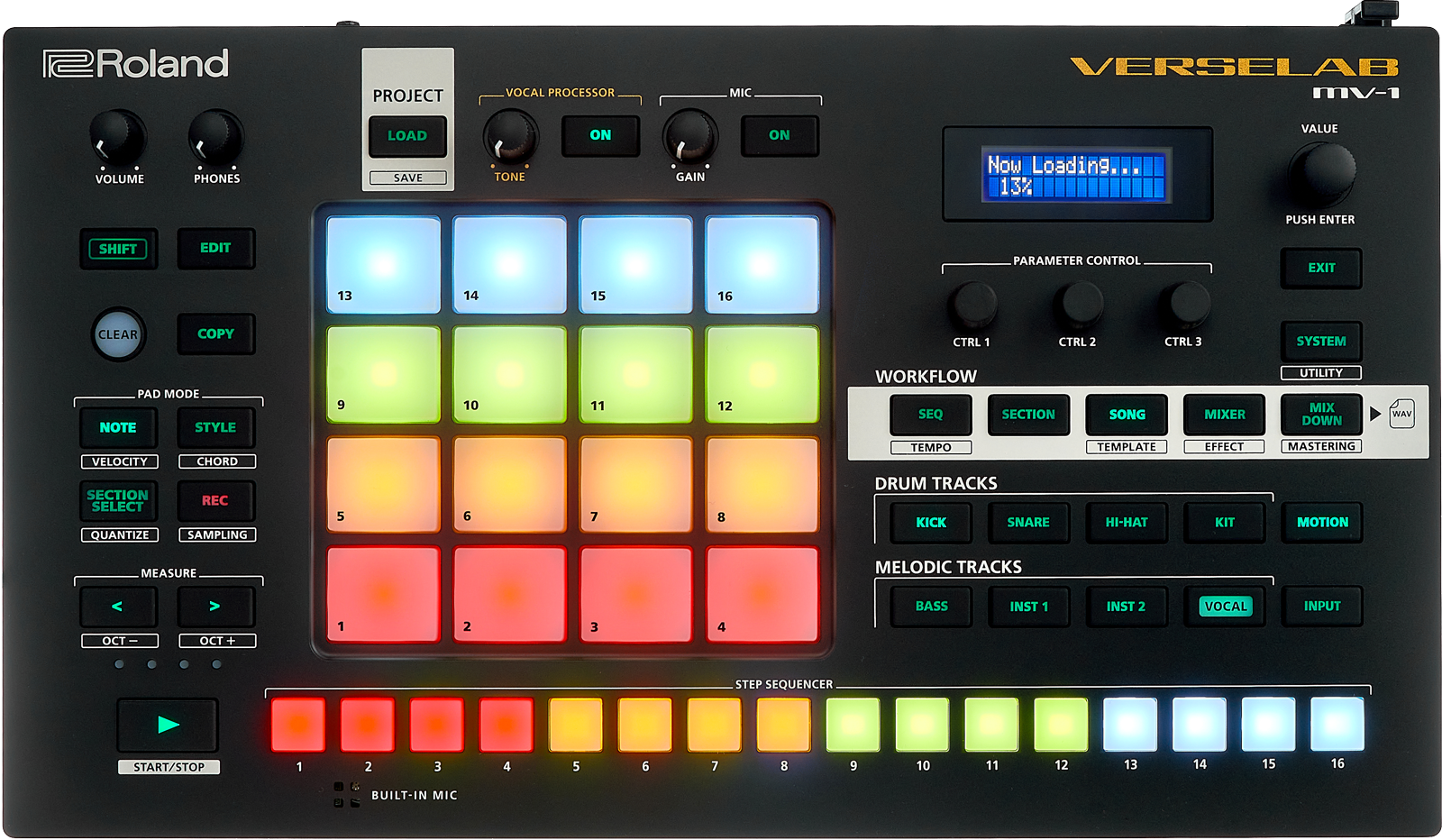 Direkt unter den drei Endlos-Encodern befindet sich die Workflow-Sektion der MV-1, erkennbar an der weißen Hinterlegung der Funktionstaster. Von links nach rechts sind die Menü-Buttons gemäß herkömmlicher Produktionsschritte angeordnet: Los gehts mit bis zu 128 Schritte langen Sequenzen, die dann wiederum zu Sections zusammengefasst, im Song Mode verkettet und mit Vocals verfeinert werden können. Im Mixing-Bereich findet das Finetuning statt und zum Schluss können Mastereffekte wie Kompressor und Limiter noch das Letzte rauskitzeln, bevor es ans Exportieren geht.