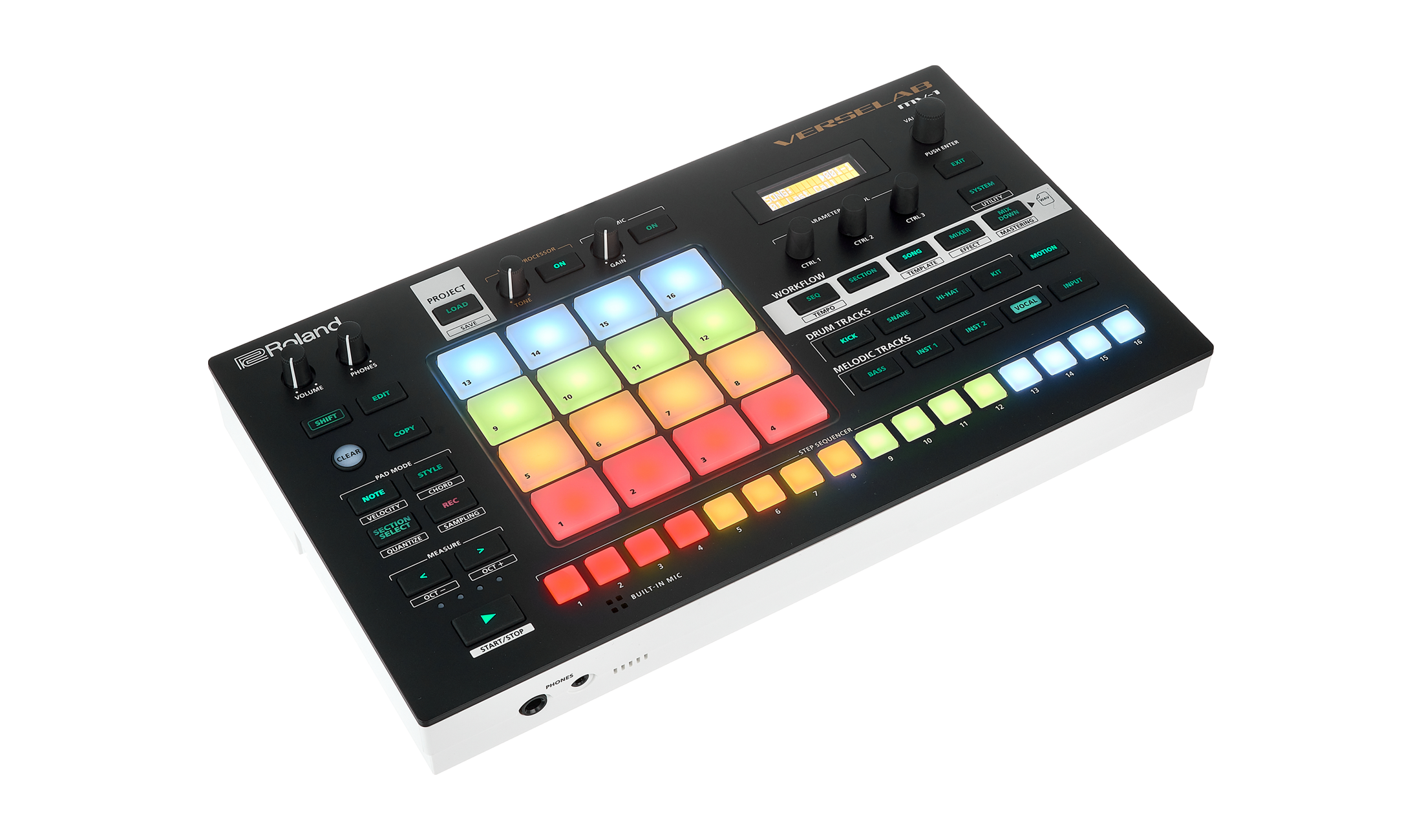 Bereits optisch erinnert das 354 x 208 x 60 mm Gehäuse an querformatige Grooveboxen wie die MPC-Live. Trotz des verwendeten Plastiks wirkt die Verarbeitung der MV-1 durchweg solide und sieht dazu einfach schick aus. Eine klassische schwarze Oberfläche mit mattweißer Unterseite – ein gelungener Spagat zwischen modern und vintage, welcher sich auch in der 808-farbigen Hintergrundbeleuchtung von Pad-Matrix und Step-Tastern zeigt. Das Display oben rechts will Roland bewusst klein gehalten haben, schließlich gehe es bei der Verselab primär um den Sound.