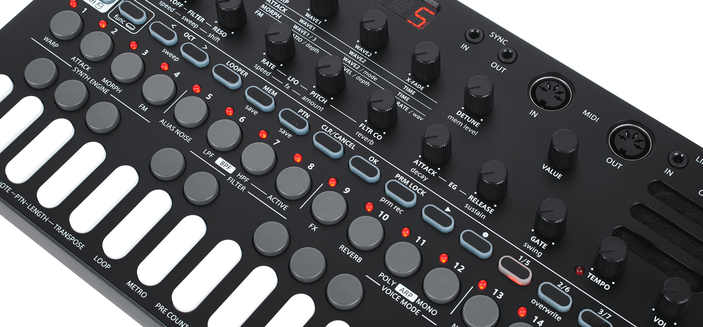 Patterns und Echtzeitspiel können dann in den Audio-Looper eingespeist werden, inklusive aller Realtime-Spielereien an Drehreglern und Co. Was nicht geloopt wird, ist der Reverb. Der scheint im Signalweg nämlich hinter dem Looper zu sitzen und beeinflusst alle laufenden Patterns, Echtzeitspiel und Loopertracks gleichermaßen. Eine weitere Besonderheit des Loopers ist, dass aufgenommene Tracks nicht gespeichert werden können.