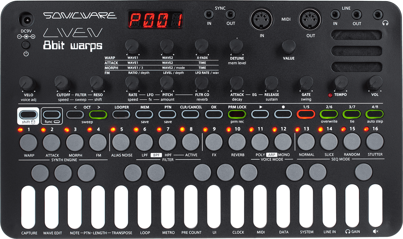 Der zeitlose, schwarze Look von 8bit Warps lässt das Instrument seriöser wirken, während Liven XFM etwas bunter und spielzeughafter anmutet. Qualitative Unterschiede gibt es in Hinblick auf die Verarbeitung jedoch keine. Nicht nur das Gehäuse, auch die Potis und Buttons des 8bit Warps sind baugleich zur Liven-Verwandtschaft. Die schwarzen Drehregler können je nach Licht zwar schwer zu erkennen sein, dafür stimmt das Feeling. Aftertouch- oder Velocity-empfindliche Tasten gibt es beim 8bit Warps nicht, die zweioktavige Klaviatur ist simpel und wie die Potis aus hartem Kunststoff. Nur die vielen Funktions-Buttons sind aus Gummi und verfügen über eine interaktive Hintergrundbeleuchtung.