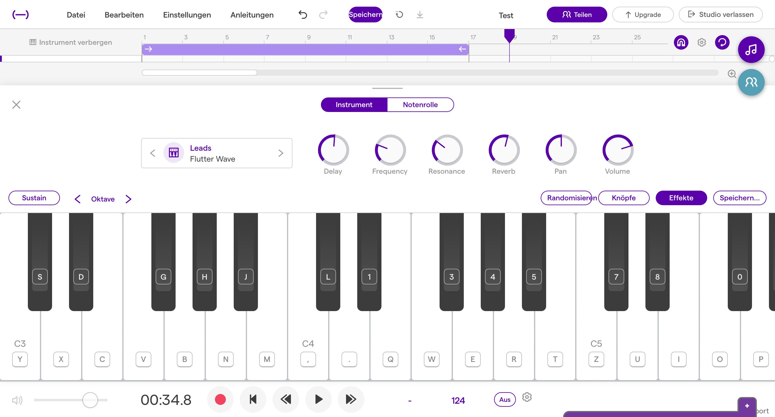 Eingespielt werden die Instrumente entweder mithilfe der Computer-Tastatur oder mit einem angeschlossenen MIDI-Keyboard. Dabei kommt ein großes Manko der DAW ans Licht: Je nach benutztem Webbrowser und Betriebssystem hat man teilweise mit einer deutlichen Latenz zu kämpfen. Apple-NutzerInnen sollen von diesem Problem verschont sein, an einem Windows-PC und über Chrome führt das aber zu erheblichen Schwierigkeiten, zumal es keine Möglichkeiten gibt, die Latenz durch Einstellungen in der Soundkarte auszugleichen. So bleibt einem nur die Nutzung der Quantisierungsfunktion oder manuelles Korrigieren in der Pianoroll übrig, wenn man nicht in der Lage ist, die Verzögerung spielerisch zu kompensieren.