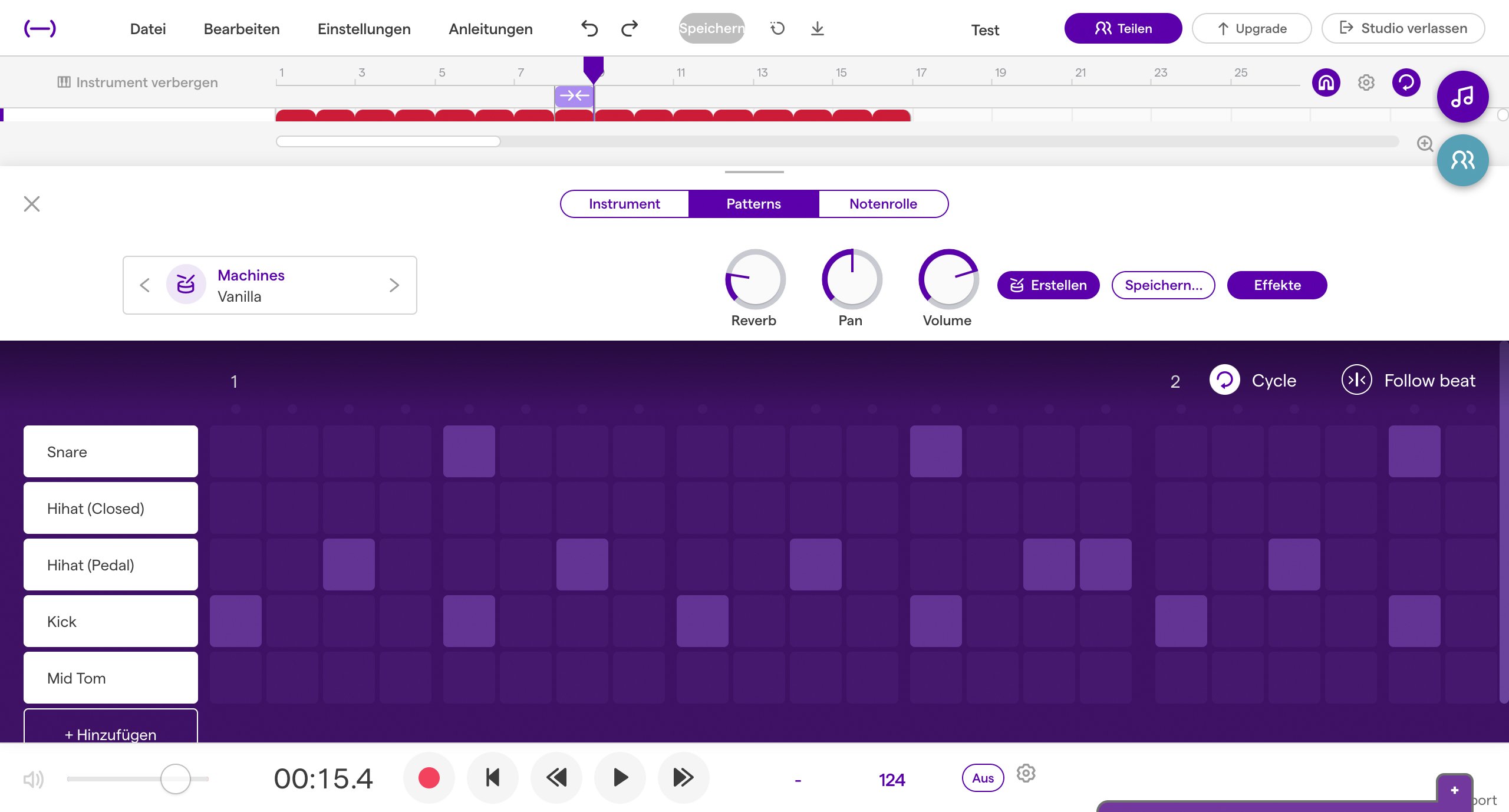 Zu diesem Zweck wollen wir einmal exemplarisch ein neues Projekt durchgehen, um die tieferen Möglichkeiten von Soundtrap zu durchleuchten und vor allem die enthaltenen Sounds auf Herz und Nieren zu überprüfen. Wir möchten zunächst einen Schlagzeug-Beat kreieren und erstellen dazu eine Spur mit der entsprechenden Drummachine. Es öffnet sich ein kleiner Step-Sequenzer, mit dem eintaktige Patterns erstellt werden können.