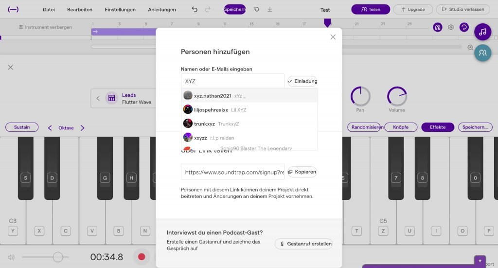 Nehmen wir einmal an, unserem Arrangement fehlt noch etwas oder wir möchten gerne ein Instrument einspielen, das wir selbst nicht beherrschen. Mit dem „Teilen“-Button können wir andere NutzerInnen einladen, an unserem Projekt mitzuarbeiten, indem wir entweder nach einem bestimmten Namen suchen oder den Link für die Session kopieren und verschicken. Haben sich entsprechende Kollaborateure gefunden, öffnet sich am rechten Bildschirmrand ein Fenster, in dem wir wahlweise per Chat oder Videoanruf miteinander kommunizieren. Alle teilnehmenden Personen können nun das Projekt bearbeiten, Spuren hinzufügen oder Aufnahmen machen.