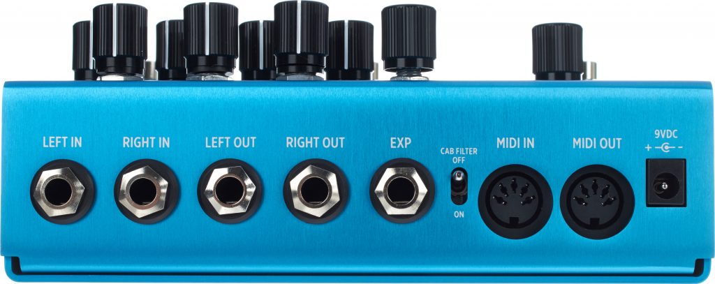 Der Anschluss fürs Netzteil entspricht trotz der hohen Rechenleistung des Geräts mit 9 Volt DC center negative dem Industriestandard – lediglich der hohe Ampere-Verbrauch von 300 mA minimum erschwert die Steckersuche. Auch wenn das passende Netzteil im Lieferumfang enthalten ist, setzen viele beim Gebrauch mehrerer Pedale auf eine Stromversorgung fürs ganze Setup. Schön, wenn man sich dabei in Sachen Kompatibilität keine Sorgen machen muss! Beim Cab Filter handelt es sich um eine zuschaltbare Speaker-Simulation, um auch ohne Gitarrenverstärker die gewohnte Frequenzbreite zu bedienen.