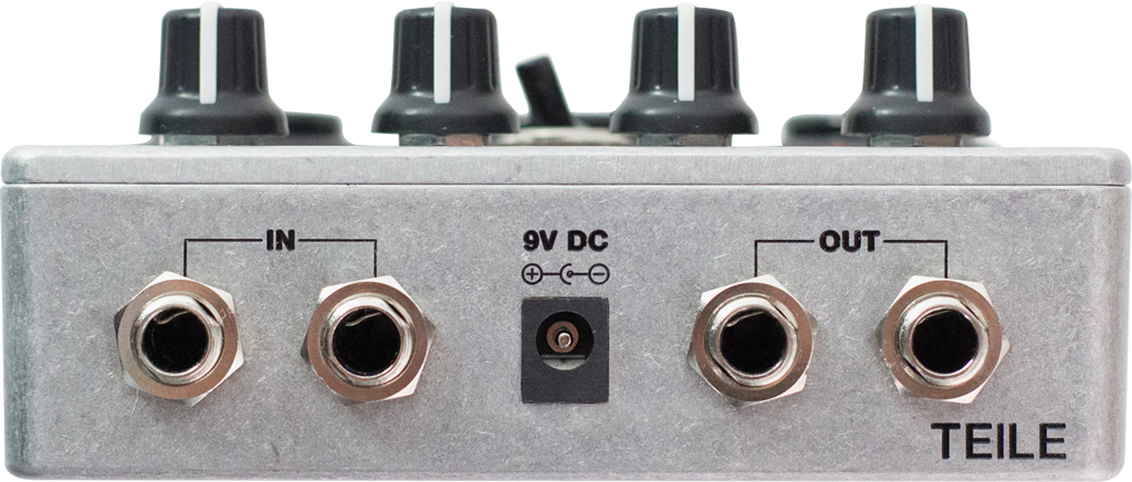 Auf der Rückseite des TEIL1 befinden sich jeweils zwei 6,3mm-Klinkenbuchsen für Stereo Ein- und Ausgang sowie ein Anschluss für das beiliegende 9V-Netzteil. Wer das gern mal verlegt, kann auch einfach ein anderes Standard-Netzteil für Fußpedale verwenden.